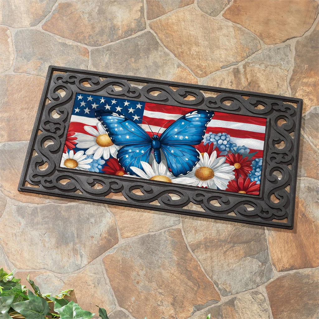 Celebrate the spirit of patriotism with this vibrant Patriotic Butterfly Sassafras Switch Mat. Featuring a striking blue butterfly set against a backdrop of the American flag and surrounded by cheerful daisies and red blooms, this mat adds a touch of charm and national pride to any doorstep. Designed to fit perfectly within a Sassafras base tray, its durable construction ensures it withstands the elements while welcoming guests in style. The mat's compact dimensions make it ideal for small entryways or as a decorative accent in any home setting.