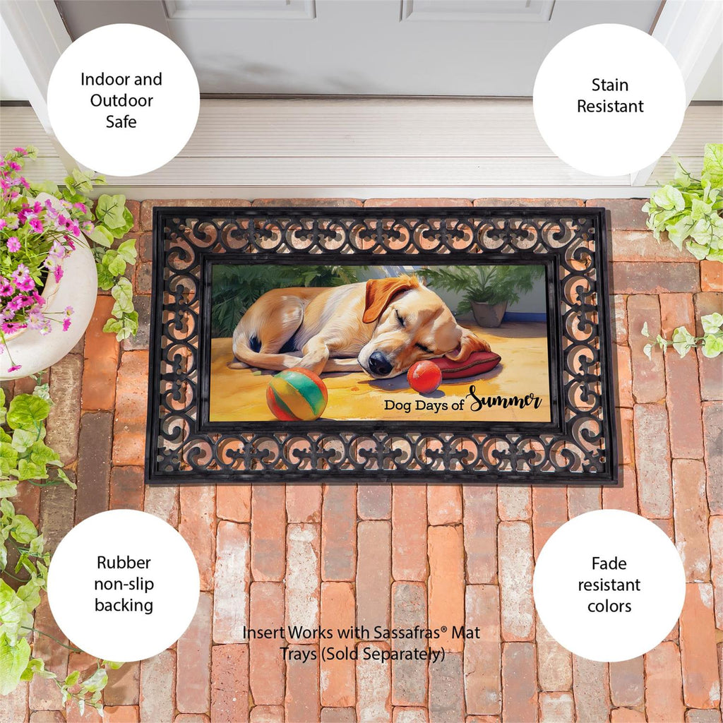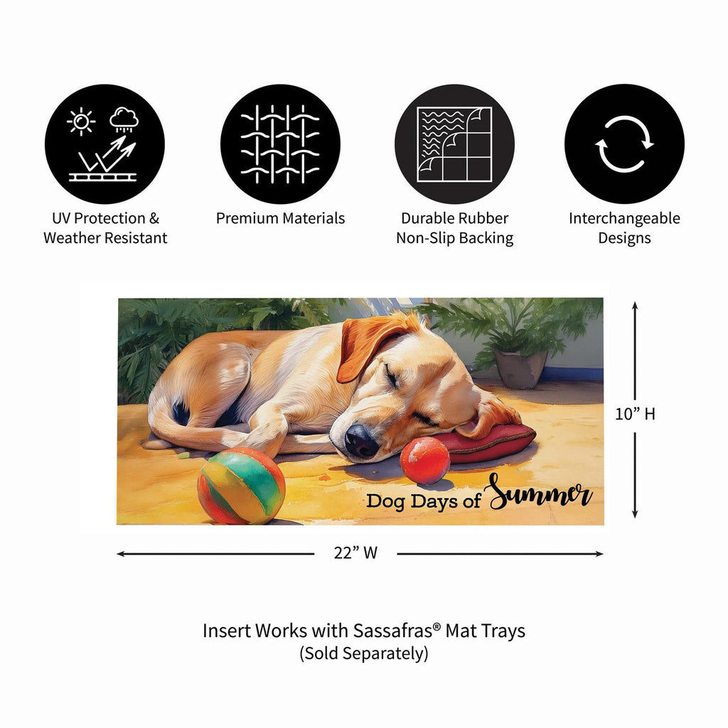 Welcome the warmth and charm of summer with the Dog Days of Summer Sassafras Switch Mat. Perfectly sized at 22 x 10 inches, this vibrant mat features an adorable sleeping dog surrounded by colorful balls, set against lush greenery. Crafted for durability, it captures the essence of lazy summer afternoons, adding a playful and inviting touch to your entryway. Ideal for use indoors or in sheltered outdoor areas, this mat is interchangeable with Sassafras bases, making it a versatile addition to your seasonal décor.