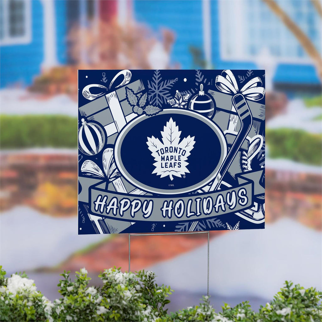 Celebrate the holidays with your favorite team by displaying this Toronto Maple Leafs Yard Sign in your garden. Measuring 24 inches by 18 inches, this sign is perfect for showing your team spirit and holiday cheer. The festive design features the iconic team logo surrounded by seasonal elements, making it a standout piece in any yard. Made from durable materials, it's designed to withstand the winter weather, ensuring your team pride remains on display. Easy to install, this sign is a great addition to any fan's holiday decorations.
