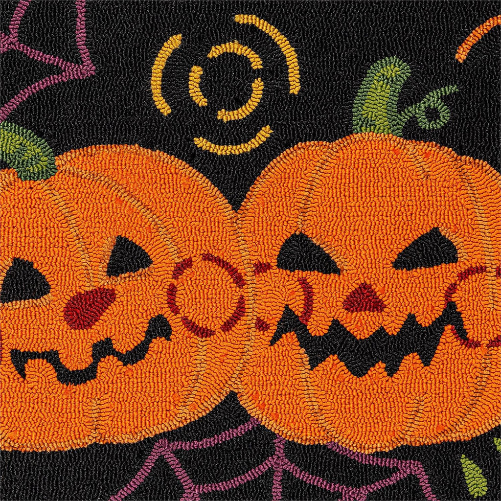 Elevate your Halloween décor with this charming Jack-O-Lantern Pumpkin Hooked Polypropylene Accent Rug, perfect for both indoor and outdoor use. Measuring 24" x 42", this whimsical rug features a vibrant design of cheerful pumpkins set against a dark backdrop, accented by playful spiderweb patterns. Crafted from durable polypropylene, it withstands high traffic and weather elements, ensuring long-lasting use. Its low-profile height of 0.5 inches allows doors to glide smoothly over it, making it an ideal addition to entryways, patios, or any festive space. Celebrate the spooky season with this eye-catching accent piece.