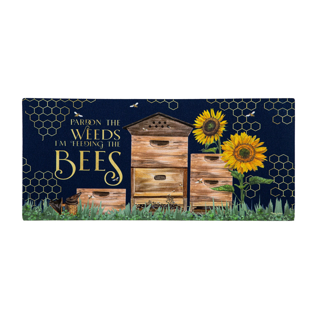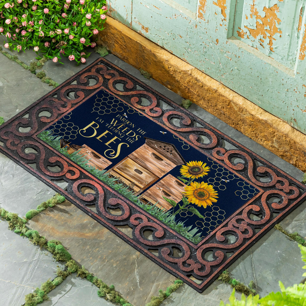 Welcome guests to your home with the charming 'Pardon the Weeds Bees' Sassafras Switch Mat, featuring a delightful bee and sunflower design. Perfect for spring, this mat adds a touch of nature to your entrance.