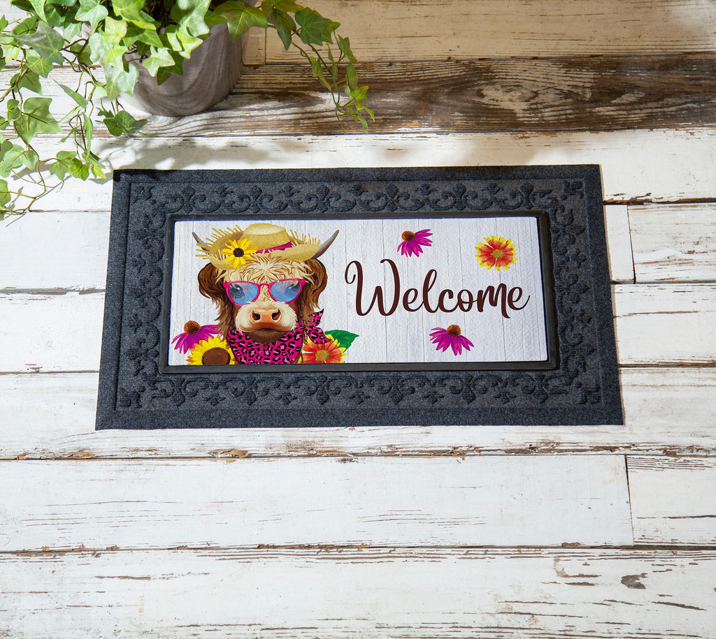 Invite a burst of summer charm into your home with the Summer Highland Cow Sassafras Switch Mat. This whimsical and vibrant doormat features an adorable highland cow adorned with sunglasses and a sunhat, surrounded by cheerful flowers. The playful design is perfect for adding a touch of personality to your entryway while welcoming guests with warmth and style. Crafted to fit in standard Sassafras bases, this mat is both versatile and durable, ideal for seasonal updates to your home’s exterior décor.