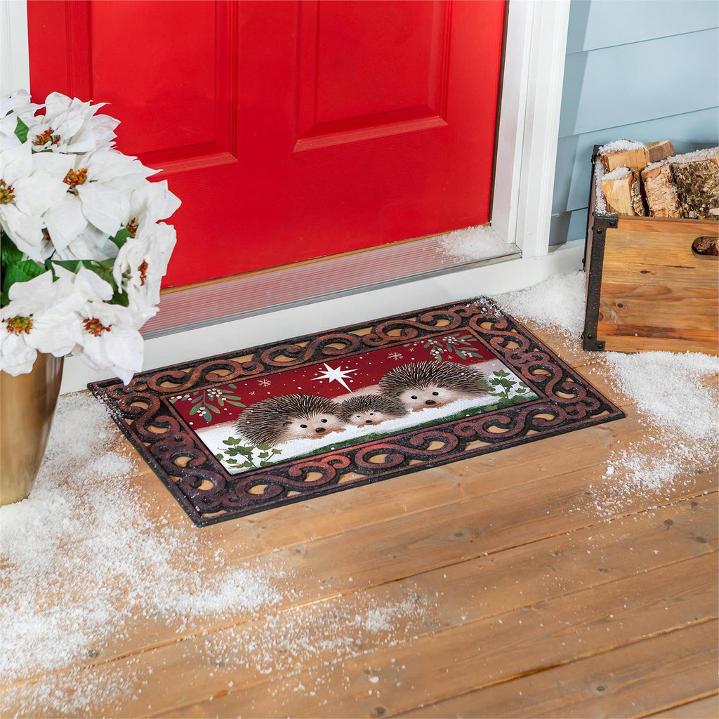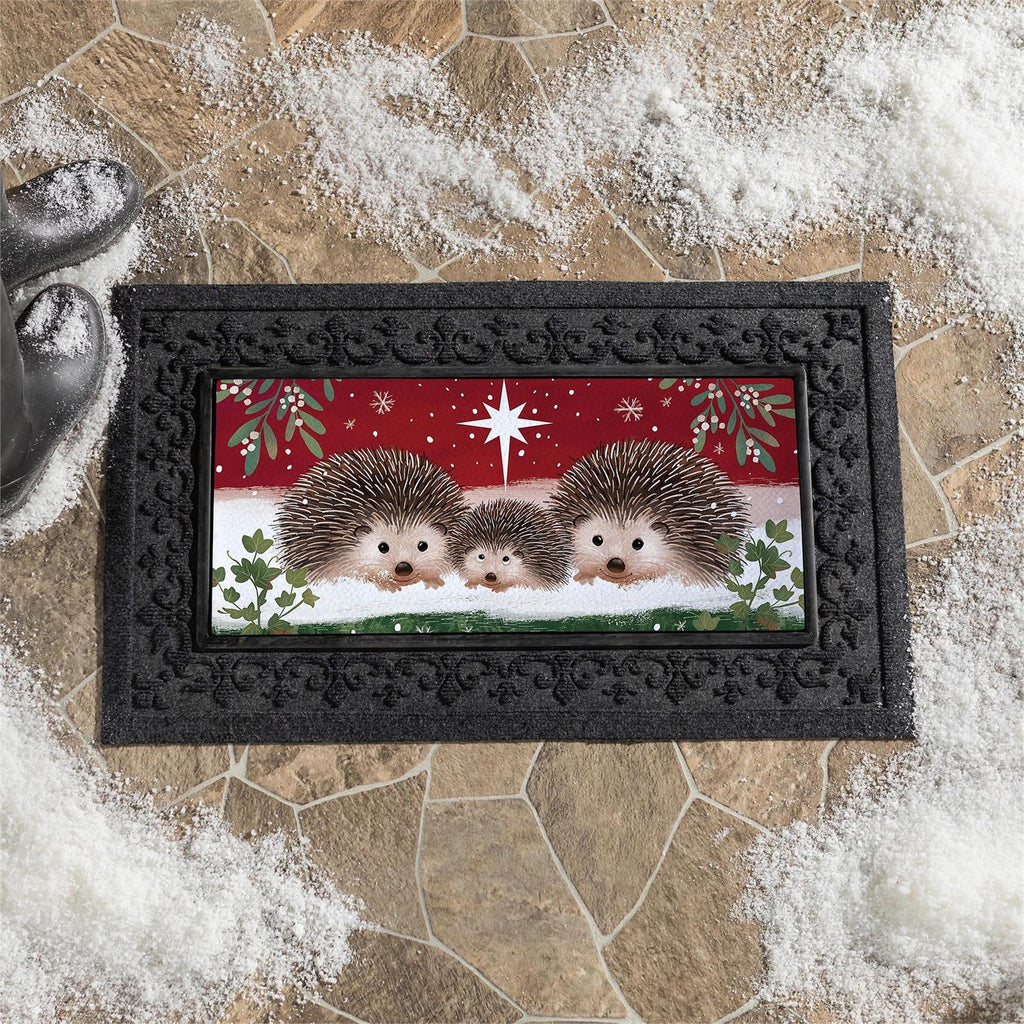 Add a touch of woodland charm to your doorstep with the Woodland Hedgehog Sassafras Switch Mat. This delightful mat features an adorable hedgehog family set against a wintery backdrop, perfect for welcoming guests during the holiday season. Measuring 22 inches in width and just 0.25 inches thick, it's designed to fit seamlessly into your existing Sassafras mat base. Crafted for durability, this insert resists fading and can withstand the elements, ensuring it remains vibrant throughout the season. Ideal for use as a festive accent for your front porch or entryway.
