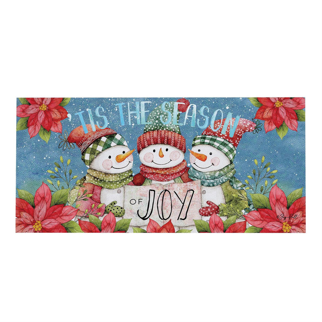 Welcome the festive season with the Christmas Cheer Snowmen Sassafras Switch Mat. This charming mat features three joyful snowmen decked out in colorful winter attire, surrounded by vibrant poinsettias and the phrase 'Tis the Season of Joy.' Designed to fit perfectly in a Sassafras base tray, this mat offers a delightful way to greet guests at your doorstep. Measuring 22 inches by 10 inches, it adds a touch of holiday spirit to any entryway while being easy to change with the seasons. Durable and weather-resistant, it's ideal for both indoor and outdoor use.