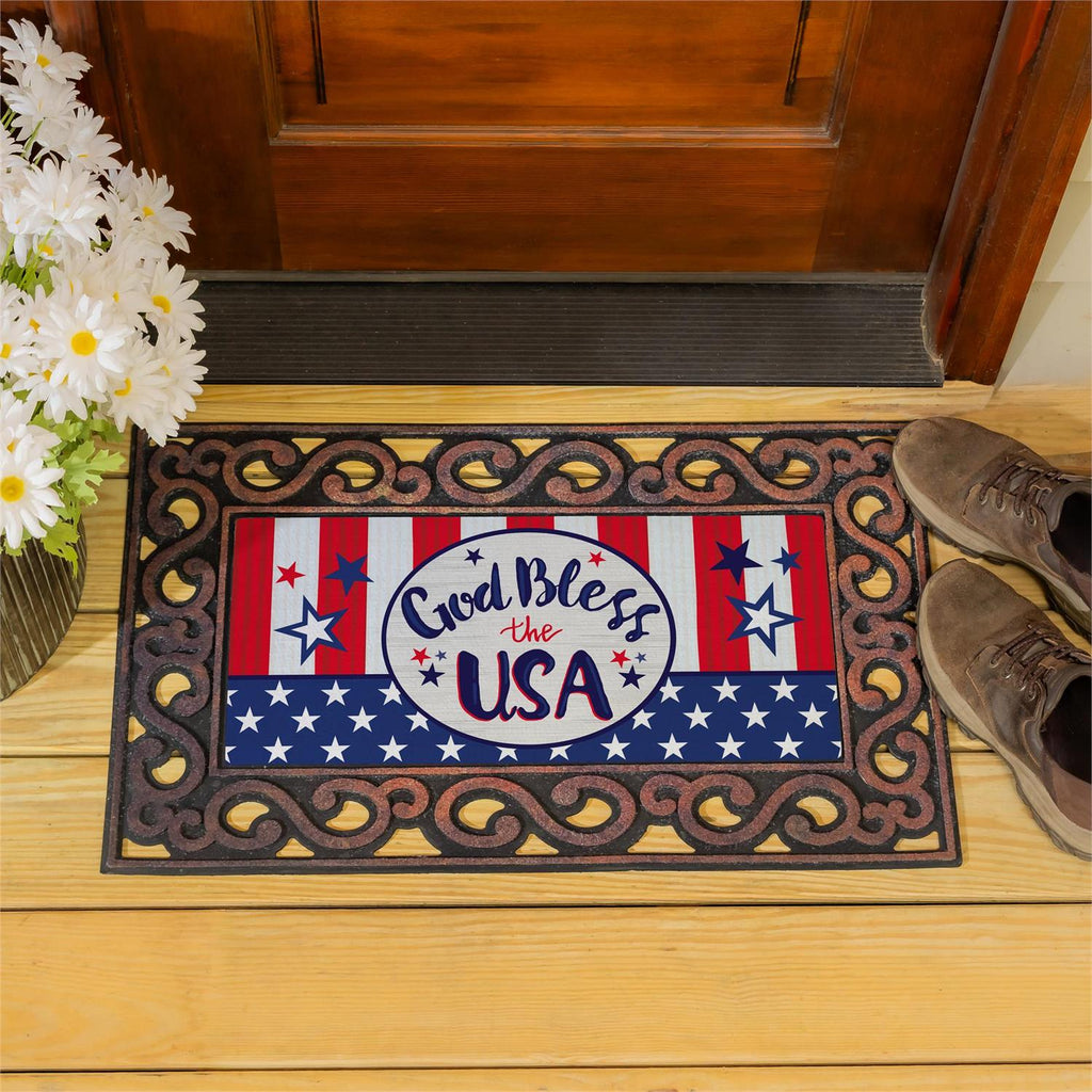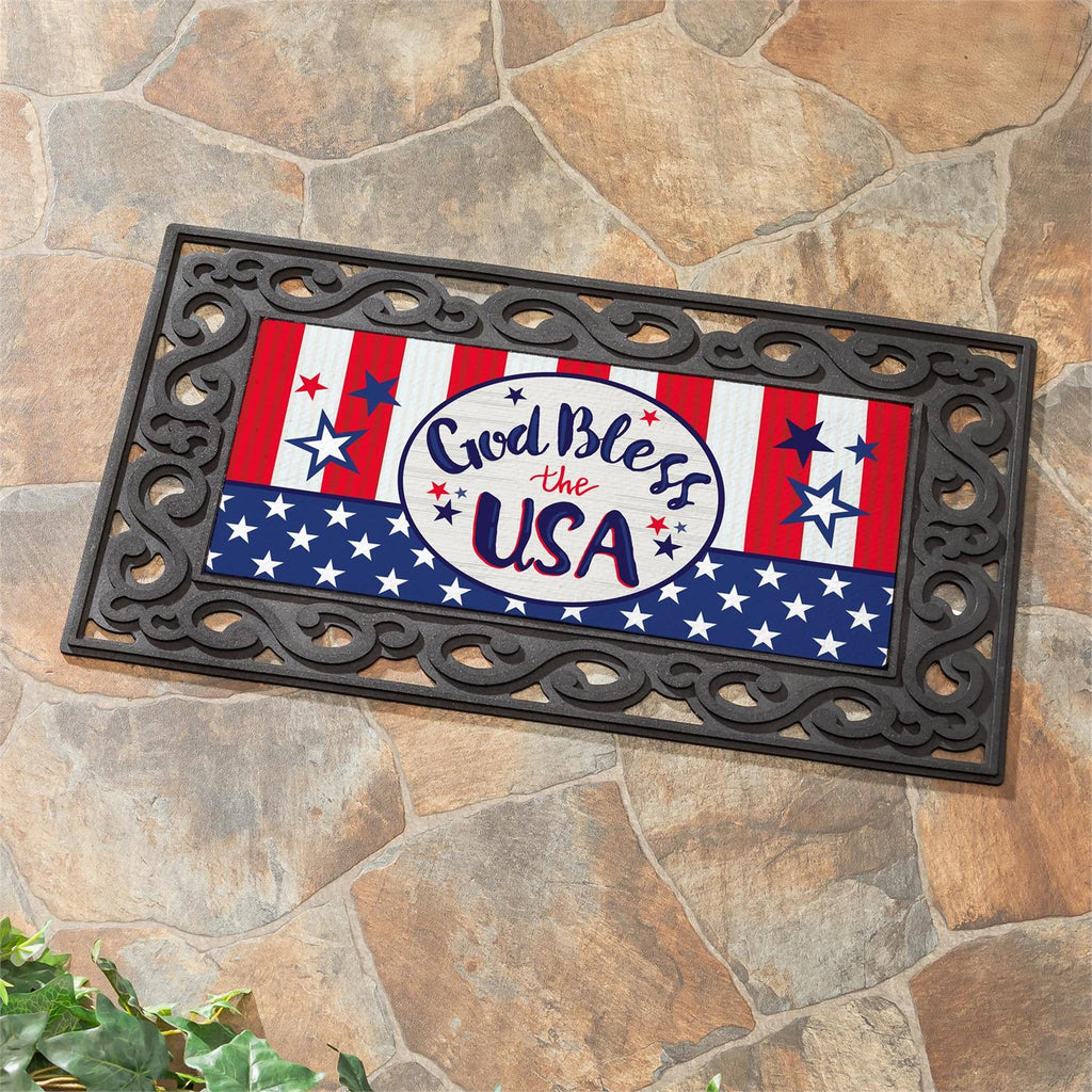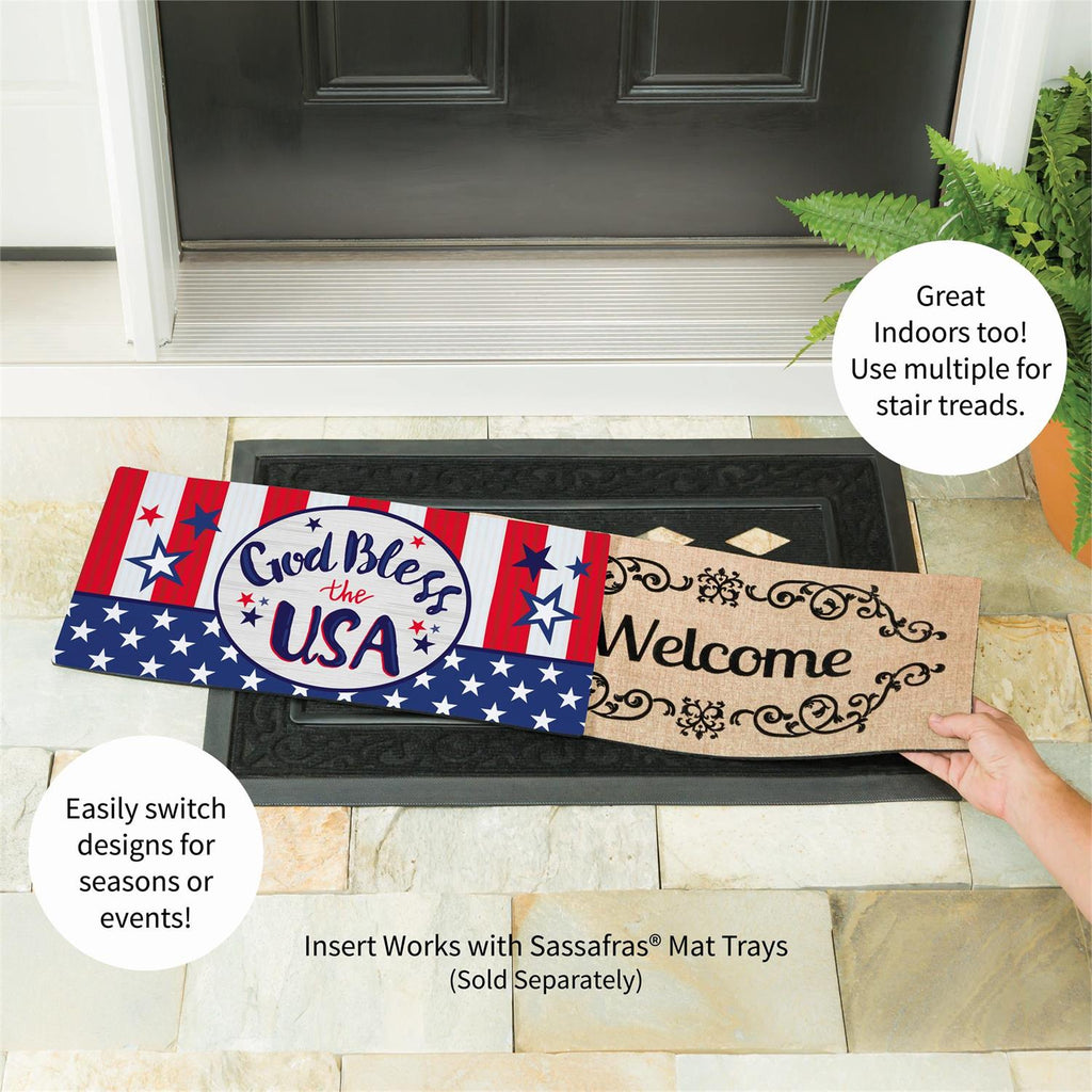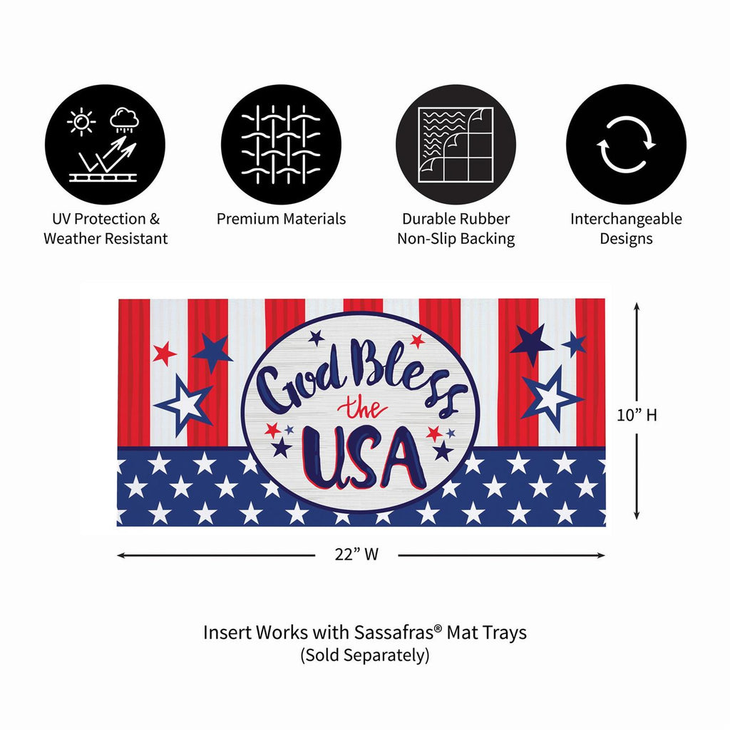 Celebrate your patriotic spirit with the Bless The USA Bow Sassafras Switch Mat. Designed to fit perfectly within standard Sassafras bases, this mat features a vibrant red, white, and blue color scheme adorned with stars and stripes. Ideal for summer celebrations or everyday use, it brings a welcoming touch to your entryway. Made from durable materials, it's perfect for both indoor and outdoor settings, adding a charming and festive flair to your home decor.