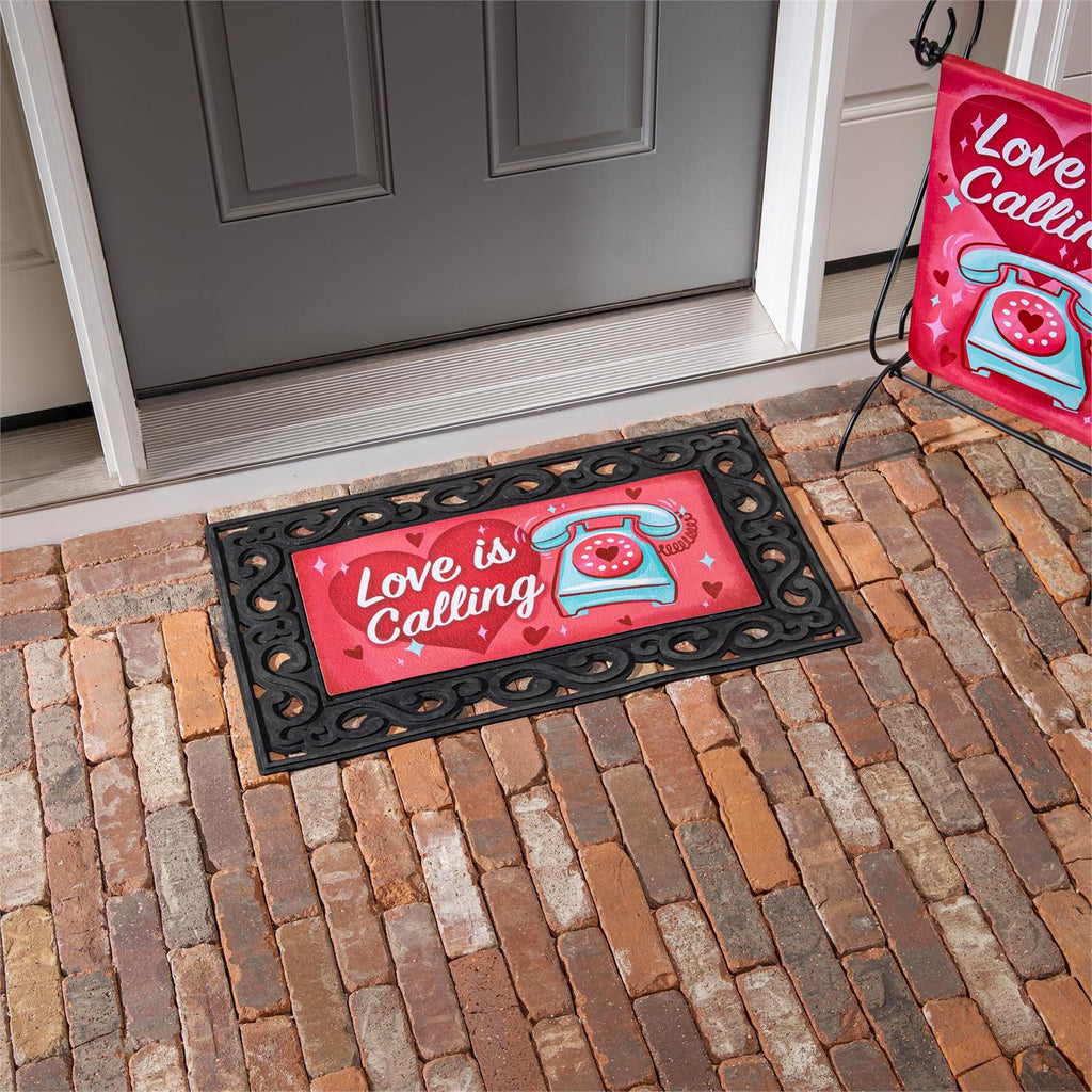 Welcome guests with charm and a touch of whimsy using the Love Is Calling Sassafras Switch Mat. Perfect for adding a pop of color to your entryway, this mat features a retro telephone design with a sweet message, making it ideal for Valentine's Day or everyday romance. Crafted to fit standard Sassafras bases, it’s both a functional and decorative addition to your home. Made from durable materials, it withstands the elements while maintaining its vibrant look. Enhance your doorstep with this delightful and playful mat.