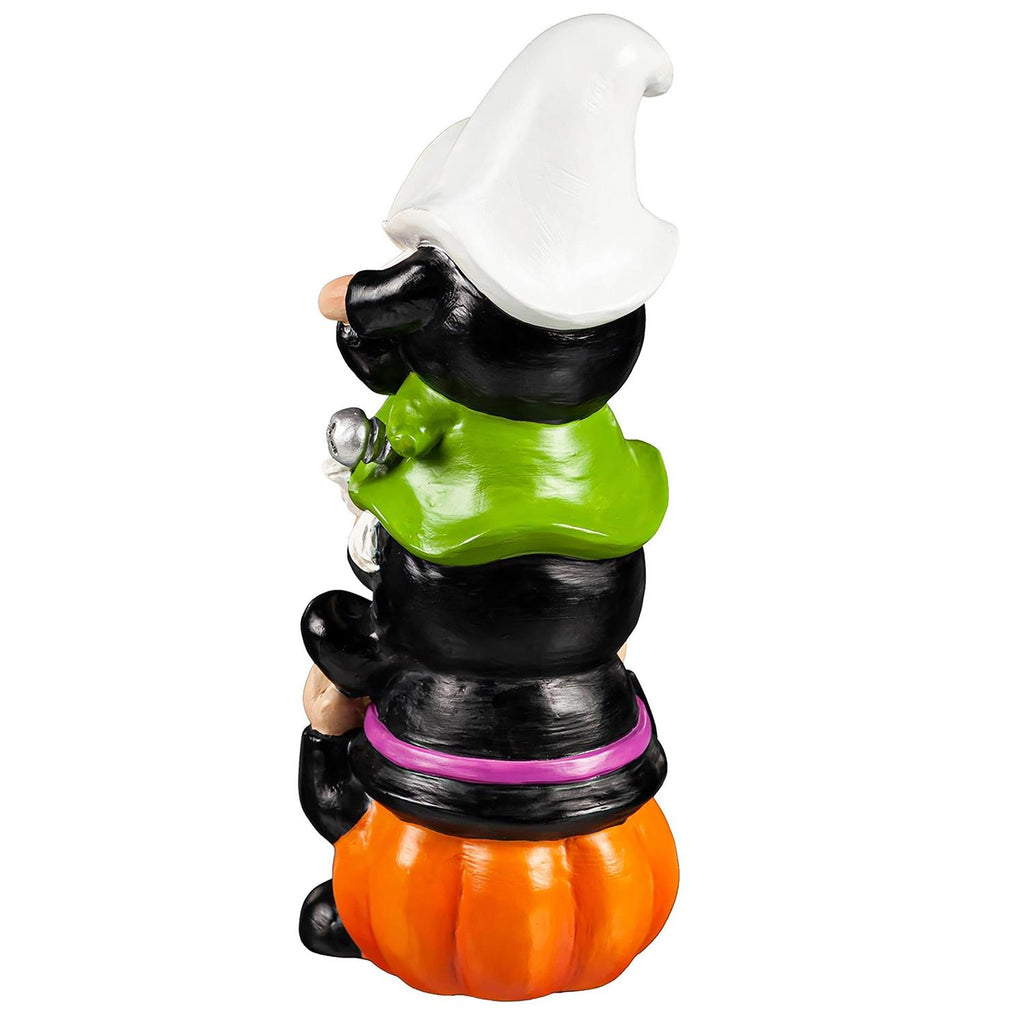 Add a whimsical touch to your Halloween decor with this charming 10.5-inch Stacked Halloween Gnome Trio. Perfectly sized for garden displays or indoor tablescapes, this statue features three playful gnomes adorned in festive Halloween attire. Crafted from durable materials, each gnome is uniquely detailed with vibrant colors, from the ghostly white cap to the pumpkin base. This delightful piece is sure to bring smiles and a touch of magic to your seasonal celebrations.