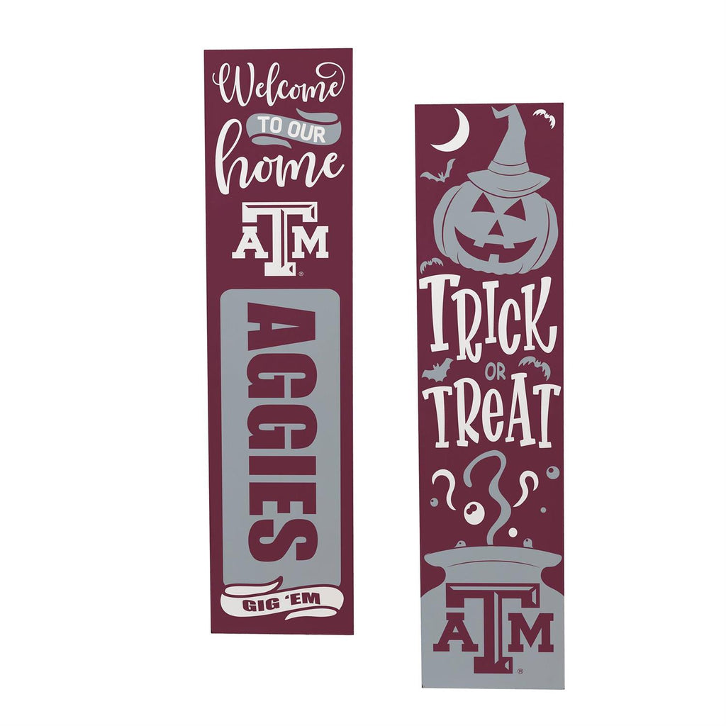 Elevate your porch décor with this 46" Double Sided Leaner featuring Texas A&M spirit and Halloween charm. Designed to make a festive statement, this leaner showcases a "Trick or Treat" design with playful Halloween elements on one side, perfect for welcoming trick-or-treaters. The other side proudly displays the Texas A&M logo, allowing you to show your school pride year-round. Made with durable materials, this leaner is built to withstand outdoor conditions. Its slim profile makes it an easy fit in any porch setting, adding seasonal style without taking up much space.