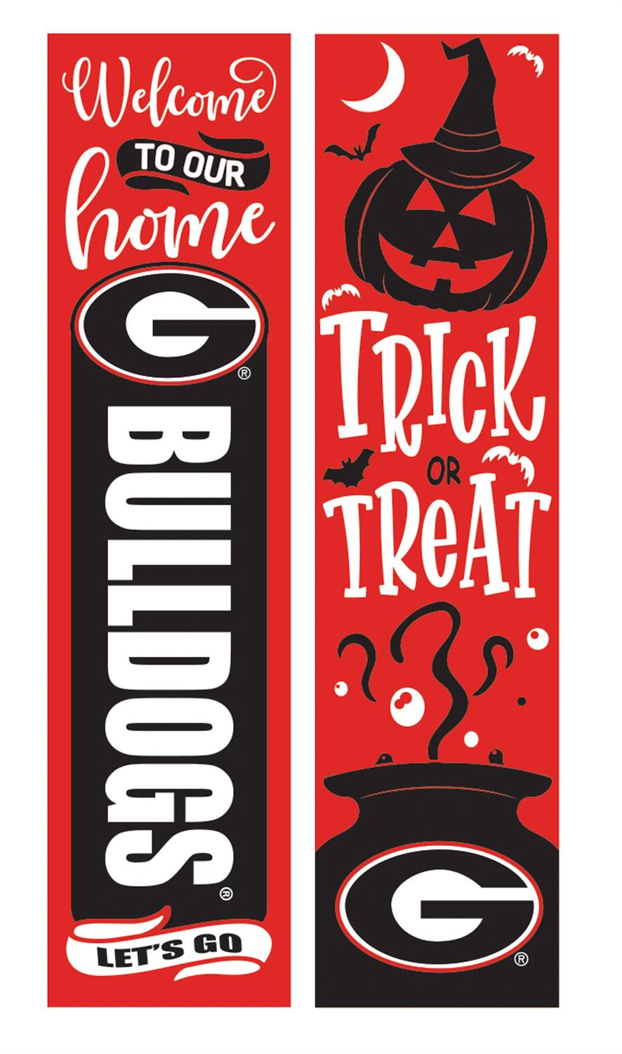 Celebrate your team spirit with this 46" Double Sided Leaner featuring the University of Georgia. Perfect for Halloween and beyond, this porch leaner showcases vibrant graphics and a spirited design that welcomes guests while showing off your Bulldogs pride. Made for durability, it is suited for both indoor and outdoor use, adding a festive touch to any porch or entryway. The double-sided feature offers versatile display options, making it a practical addition to your home décor. With its bold colors and collegiate theme, this leaner stands as a proud statement piece for fans.