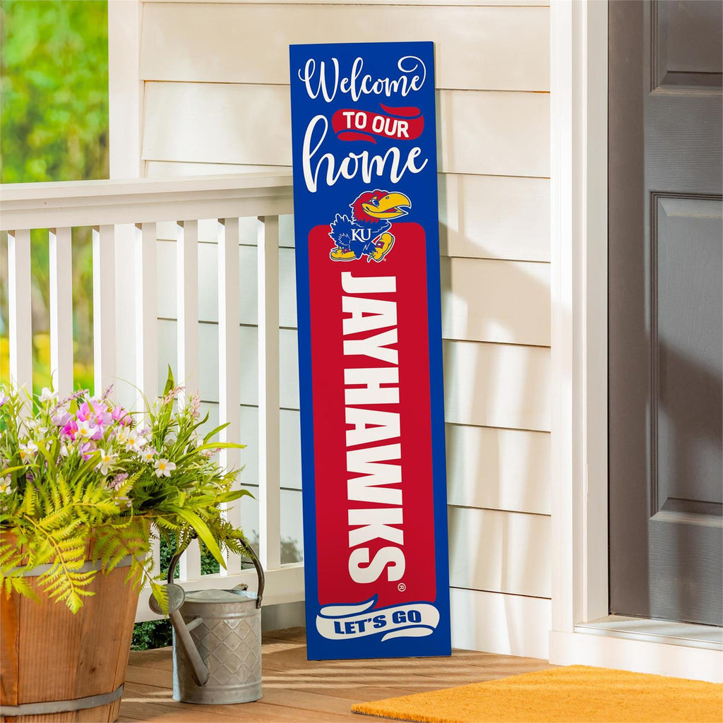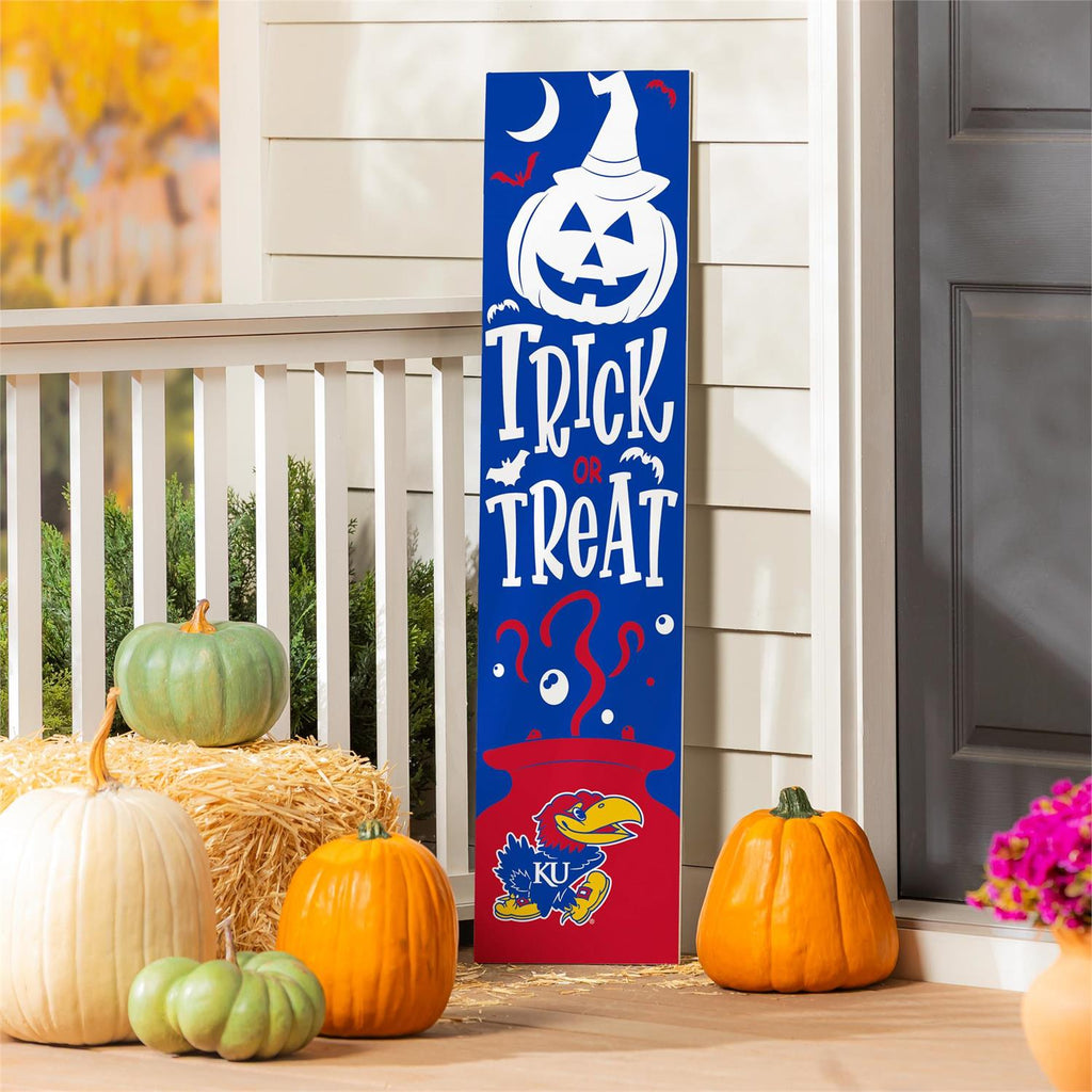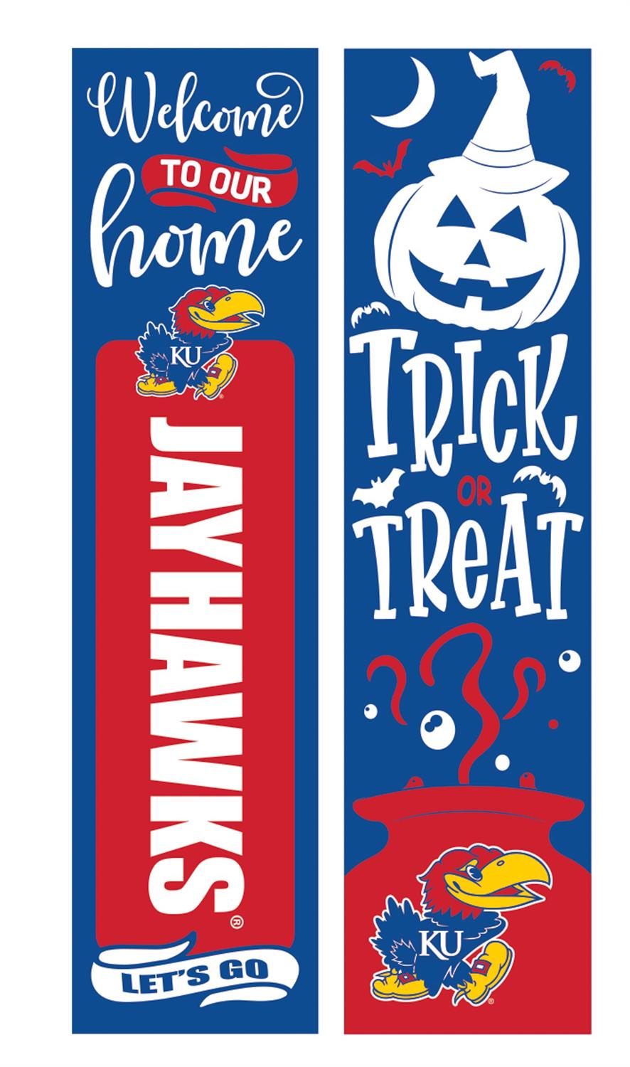 Celebrate Halloween with a touch of collegiate pride using this 46" double-sided porch leaner. Designed for University of Kansas fans, this vibrant leaner features a festive Halloween theme on one side, complete with a jack-o'-lantern and spooky graphics. The other side showcases your team spirit with the KU logo, making it perfect for game days and seasonal decoration. Crafted for durability, this leaner is ideal for indoor or outdoor use, adding charm to any porch or entryway. Its slim profile ensures it fits effortlessly into any space.