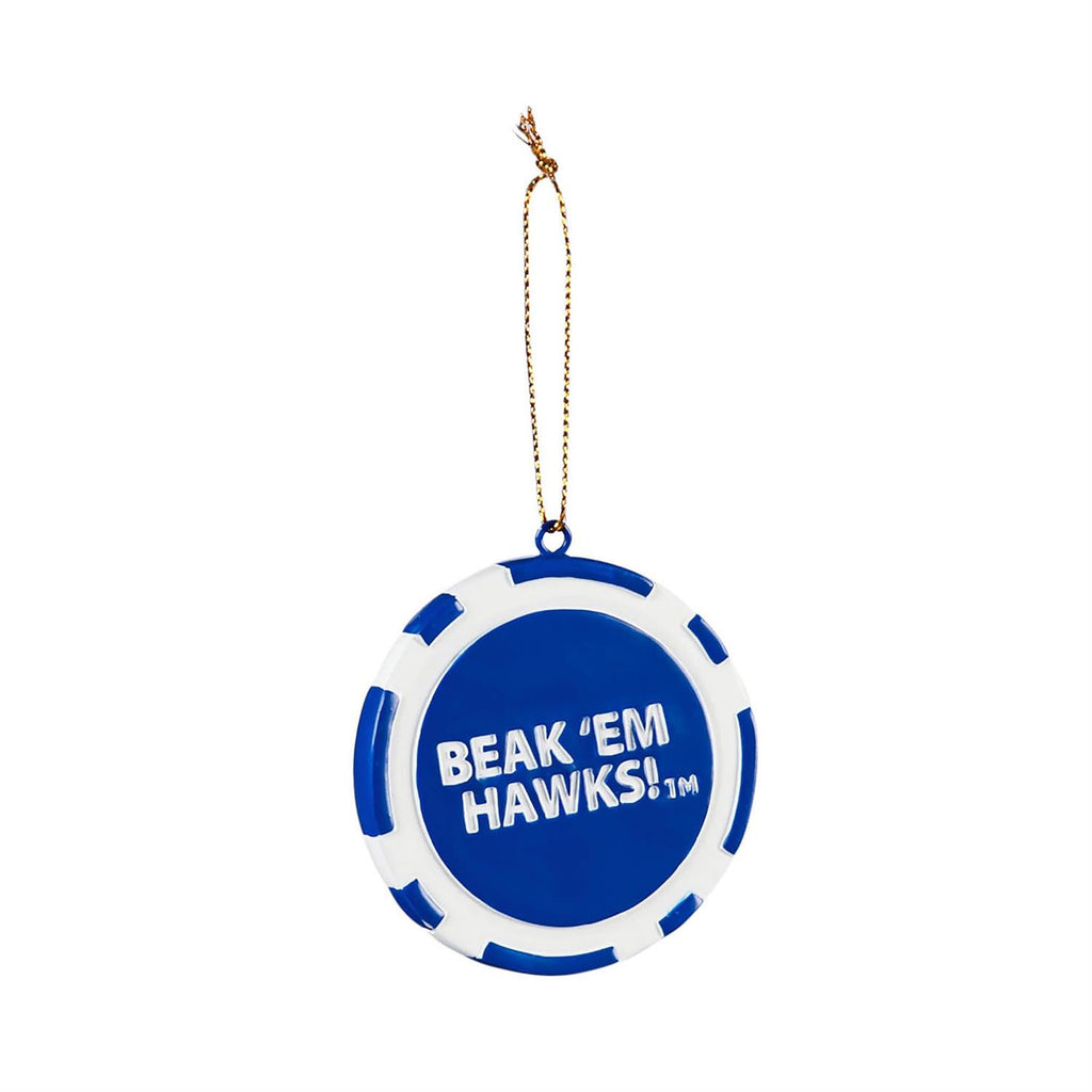 Show your school spirit with the University of Kansas Game Chip Ornament. This unique ornament is perfect for decorating your Christmas tree or adding a touch of collegiate pride to any space. Made from durable materials, its vibrant blue and white design features the iconic phrase 'Beak 'Em Hawks!' It’s an ideal gift for any Jayhawks fan or alumni, capturing the excitement of game day all year round. Compact and lightweight, it’s easy to hang and display.