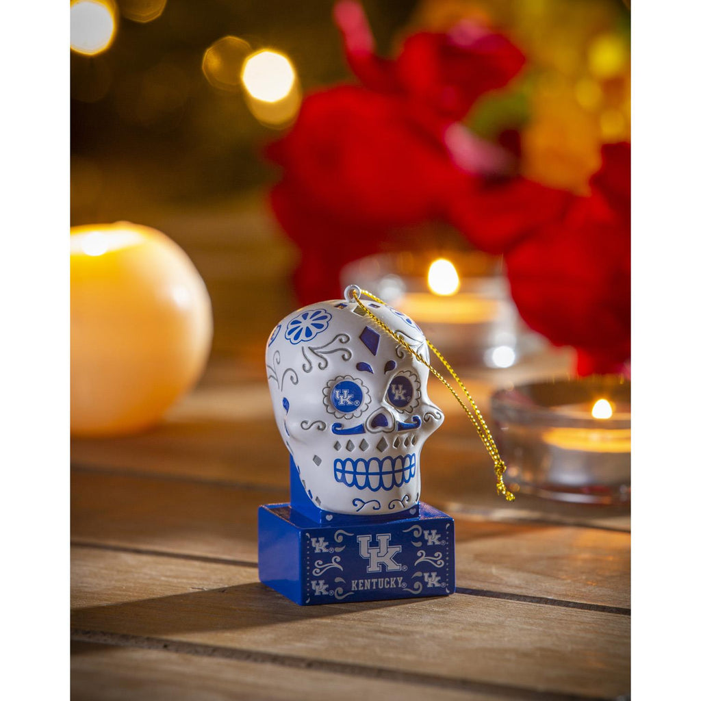 Celebrate your University of Kentucky pride with this unique Sugar Skull Ornament. Perfect for fans and collectors, this ornament combines the traditional sugar skull design with the iconic university colors and logo. Measuring 2.33 inches in length and width, and standing 4.12 inches tall, it's an ideal addition to your holiday décor or as a year-round display piece. Crafted with meticulous detail, this ornament is sure to stand out in any setting, making it a great gift for any Wildcats enthusiast.