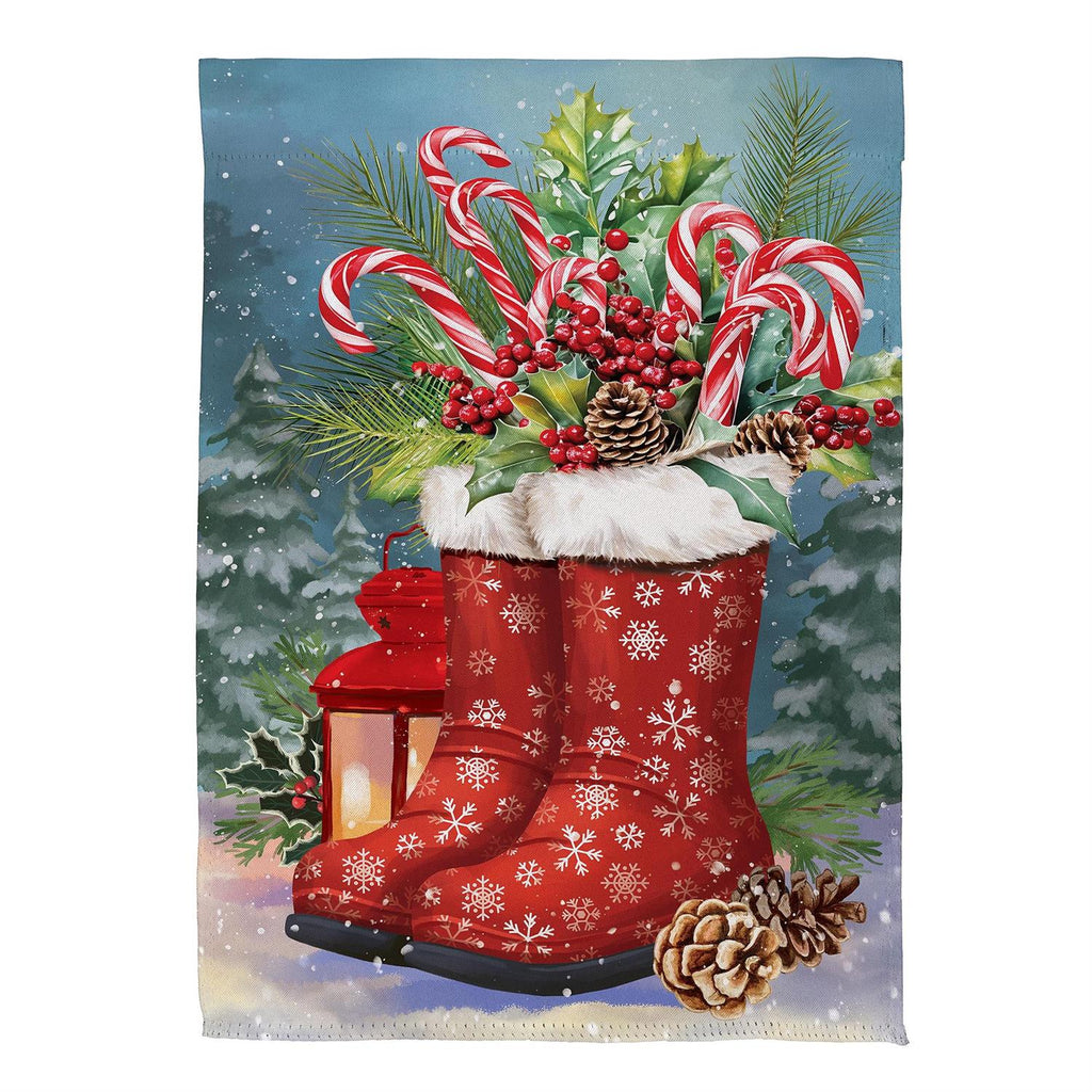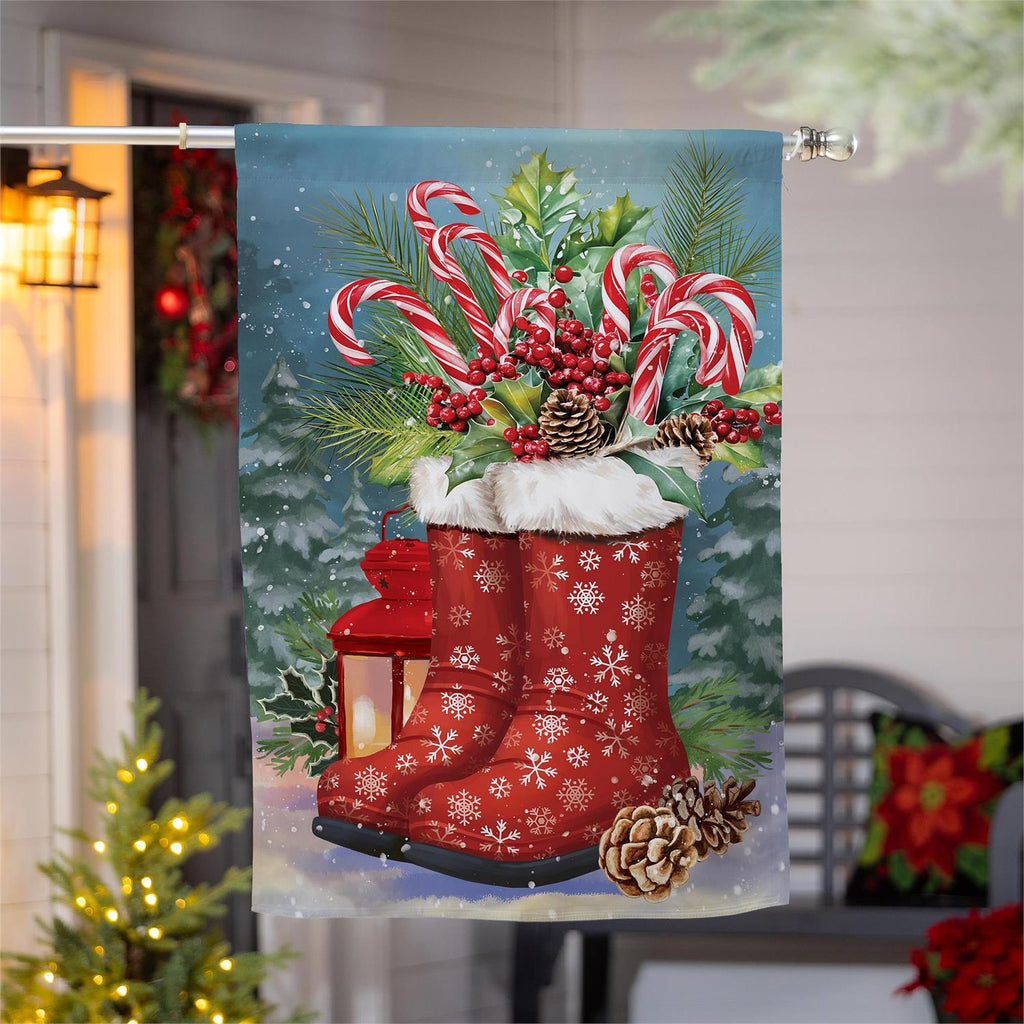 Celebrate the winter season with this delightful Winter Boots Suede House Flag. Measuring 29 inches wide and 43 inches high, this flag features a charming design with red suede boots filled with candy canes, holly, and pinecones. The vibrant colors and festive imagery bring a touch of holiday spirit to your home. Made from durable suede, this flag is perfect for adding a seasonal flair to your outdoor décor, greeting guests with warmth and cheer. Ideal for winter and holiday displays, it’s a beautiful addition to any garden or porch setting.