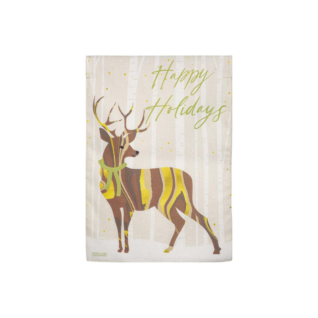 Decorate for the season and welcome friends and family to the home with this burlap garden flag. It features a beautiful deer with gold marbling standing in a forest. Its “Happy Holidays” message is sure to make guests smile. Crafted of medium-weight, soft polyester burlap fabric, this flag has the look and feel of real burlap. Artwork is heat transferred onto both sides of the textured fabric to create a natural, crafted look. The poly-burlap is a durable and weatherproof material that will not fade or fray after continued use. All flags also feature a sleeve for use with any standard flagpole or stand, sold separately.