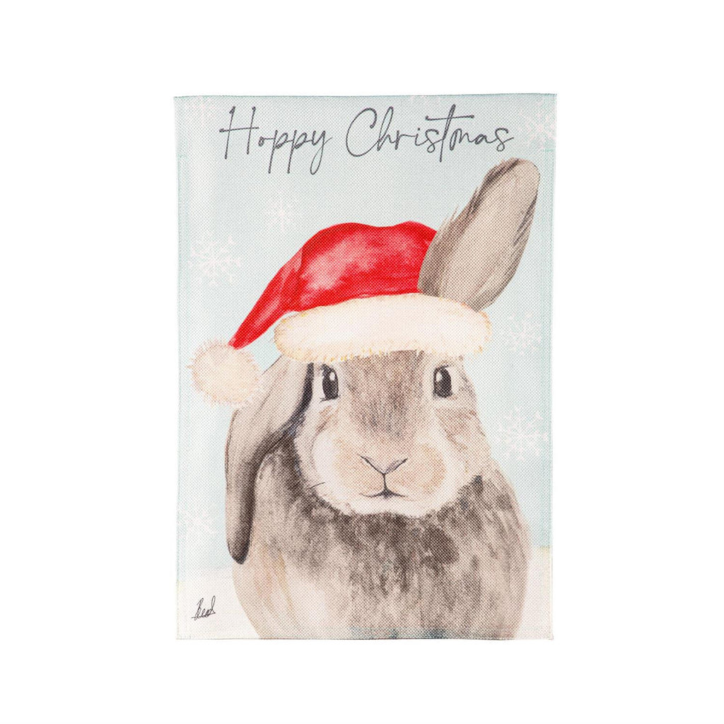 Decorate for the season and welcome friends and family to the home with this burlap garden flag. It features an adorable bunny wearing a Santa hat with a sweet message that reads “Happy Christmas.” The background has snowflakes falling from the sky for extra festive flair. Crafted of medium-weight, soft polyester burlap fabric, this flag has the look and feel of real burlap. Artwork is heat transferred onto both sides of the textured fabric to create a natural, crafted look. The poly-burlap is a durable and weatherproof material that will not fade or fray after continued use. All flags also feature a sleeve for use with any standard flagpole or stand, sold separately.