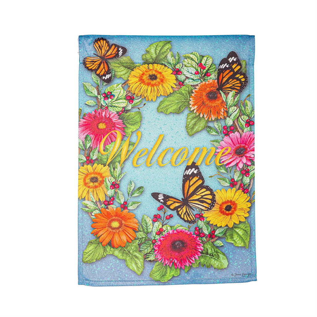 This Gerbera Butterflies Suede Garden Flag brings a beautiful statement to any garden. This Suede Reflections flag is made of medium-weight, polyester suede that provides a soft and durable texture. Artwork is heat transferred onto the sun-blocking material so that it is easily viewed from both sides. The weatherproof poly-suede will not fray or fade with continued outdoor use. This flag features a sleeve for use with any standard flagpole or stand, sold separately.
