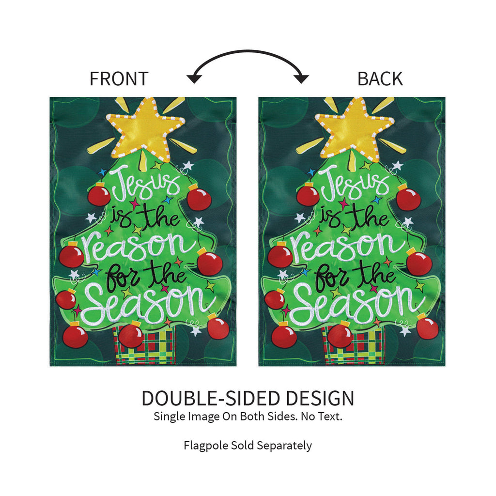 Celebrate the season with the Jesus Is The Reason Applique Garden Flag, featuring a vibrant Christmas tree design. Perfect for adding a festive touch to your garden during winter.