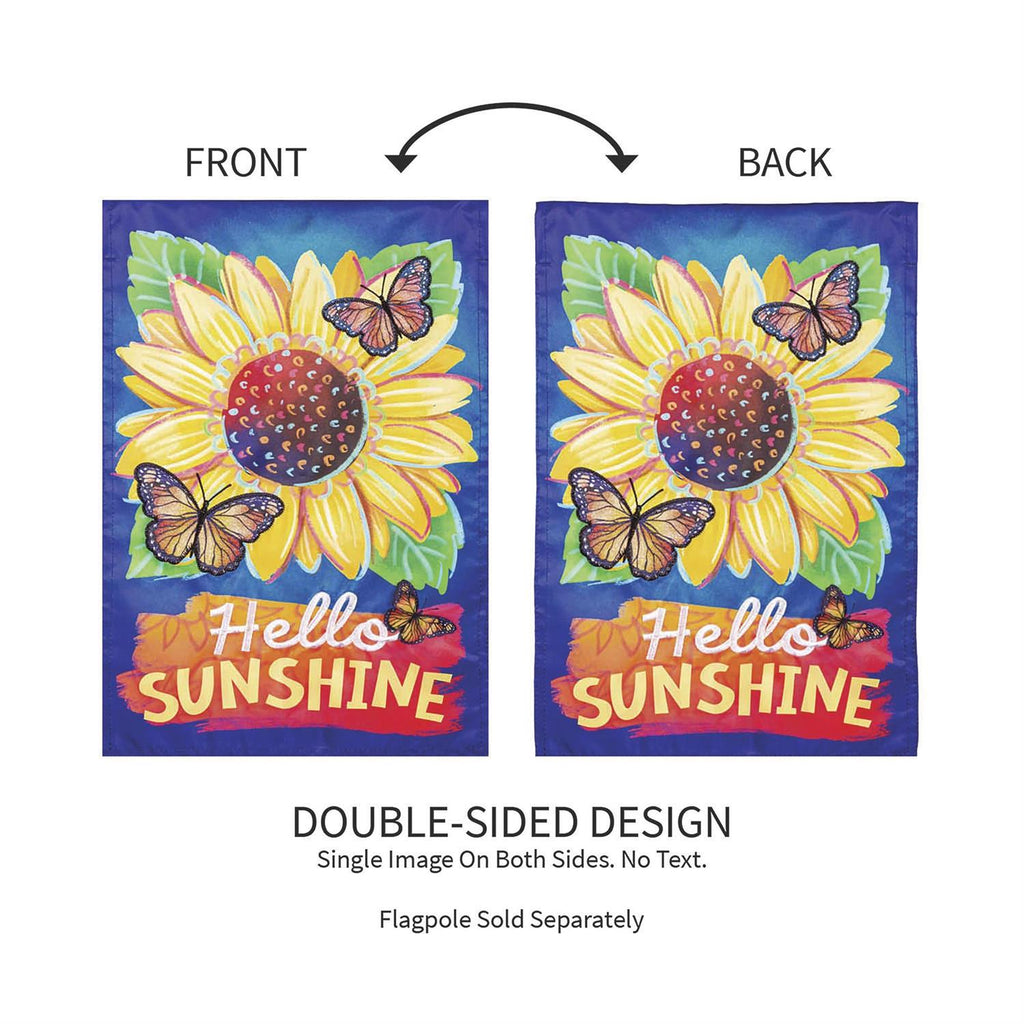 Add a refreshing touch to any yard or garden with this flag. With a sweet “Hello Sunshine” message and sunflower design, this flag welcomes friends and family to the home in style. Each Evergreen applique flag is carefully crafted from multiple layers of 310 denier nylon made from recycled plastic that can withstand a variety of weather conditions. We combine pieces of fade-resistant, strong fabric with tight, detailed stitching to create a dimensional mosaic effect. The soft yet heavyweight material illuminates beautifully in sunlight. Each flag features a sleeve that fits standard flagpoles or stands, sold separately. Due to the nature of the packaging, wrinkling may have occurred. Once item is unfolded and mounted on hardware, the creases will naturally fall out. Spot clean only. Never put in a dryer. When not in use, flags can be hung in a closet or placed in a storage container.