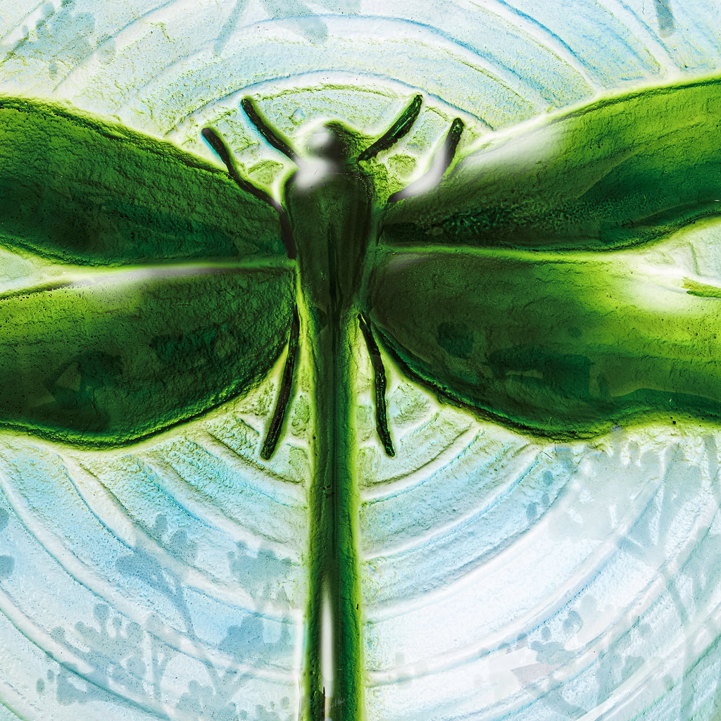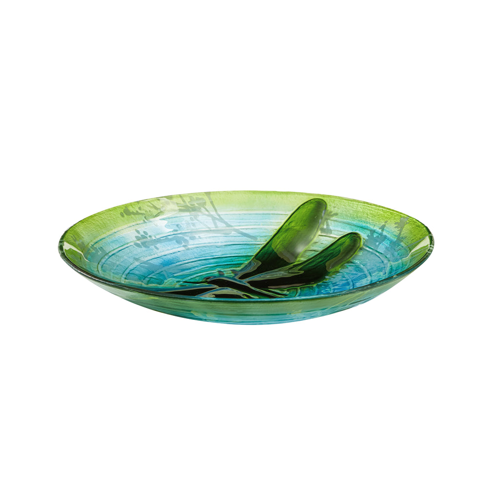 Measuring 18 inches in diameter and boasting hand-painted details, this Fluttering Dragonfly Pond birdbath holds up to 64 ounces of liquid. Crafted from durable glass, the bowl is outdoor safe and fade-resistant, ensuring it stays vibrant season after sea