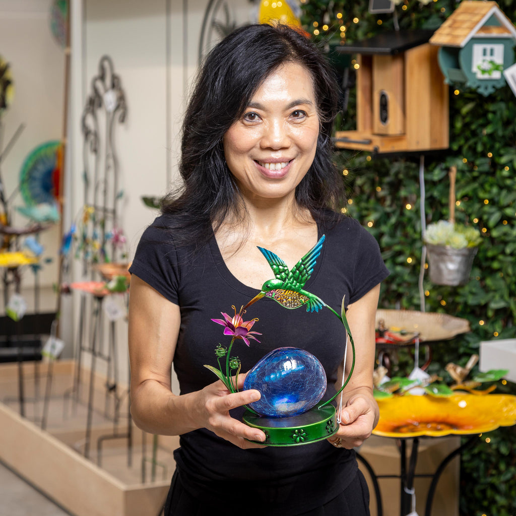 Enhance your outdoor space with this beautiful LED Metal Hummingbird garden statue, featuring a vibrant orb and intricate design. Perfect for adding a touch of whimsy to your garden decor.