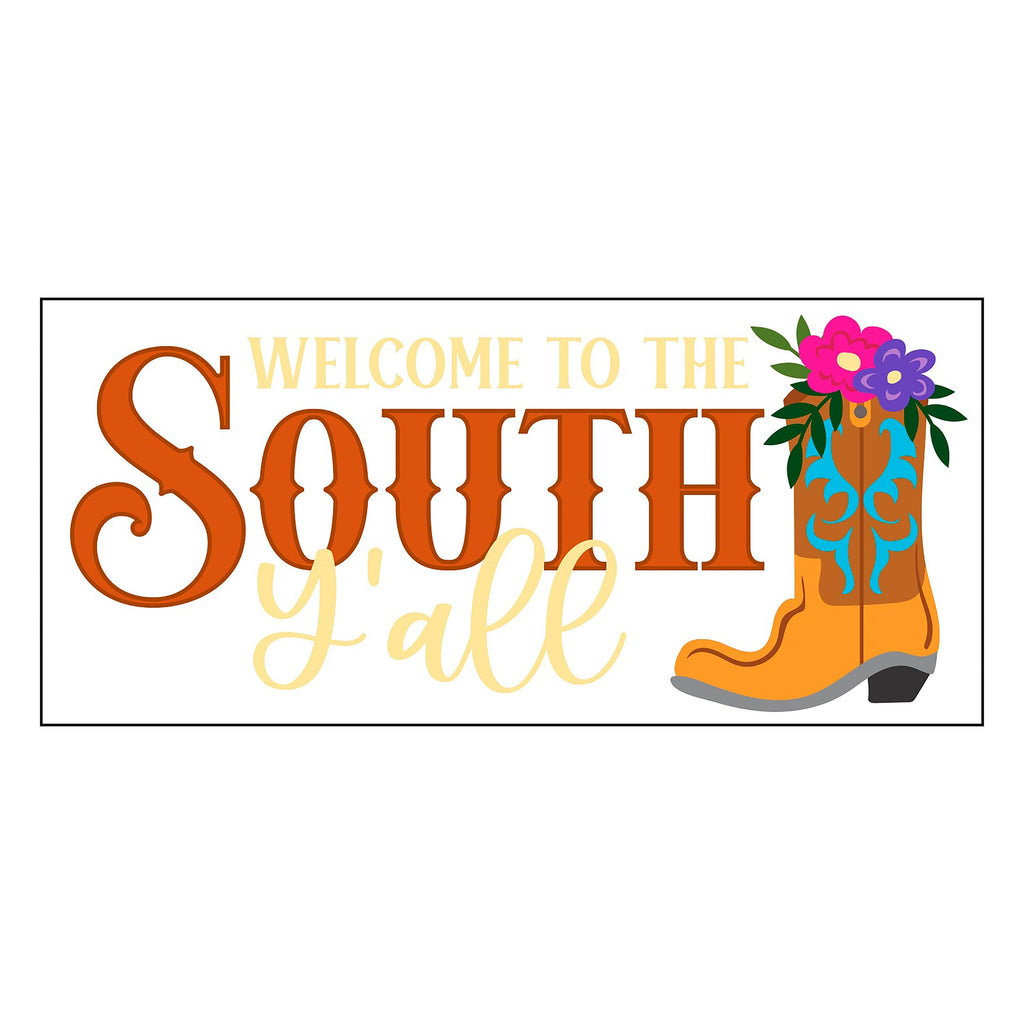 Welcome guests with a touch of southern charm using the 'Welcome to the South Y'all' flocked coir mat, featuring a vibrant cowboy boot design.