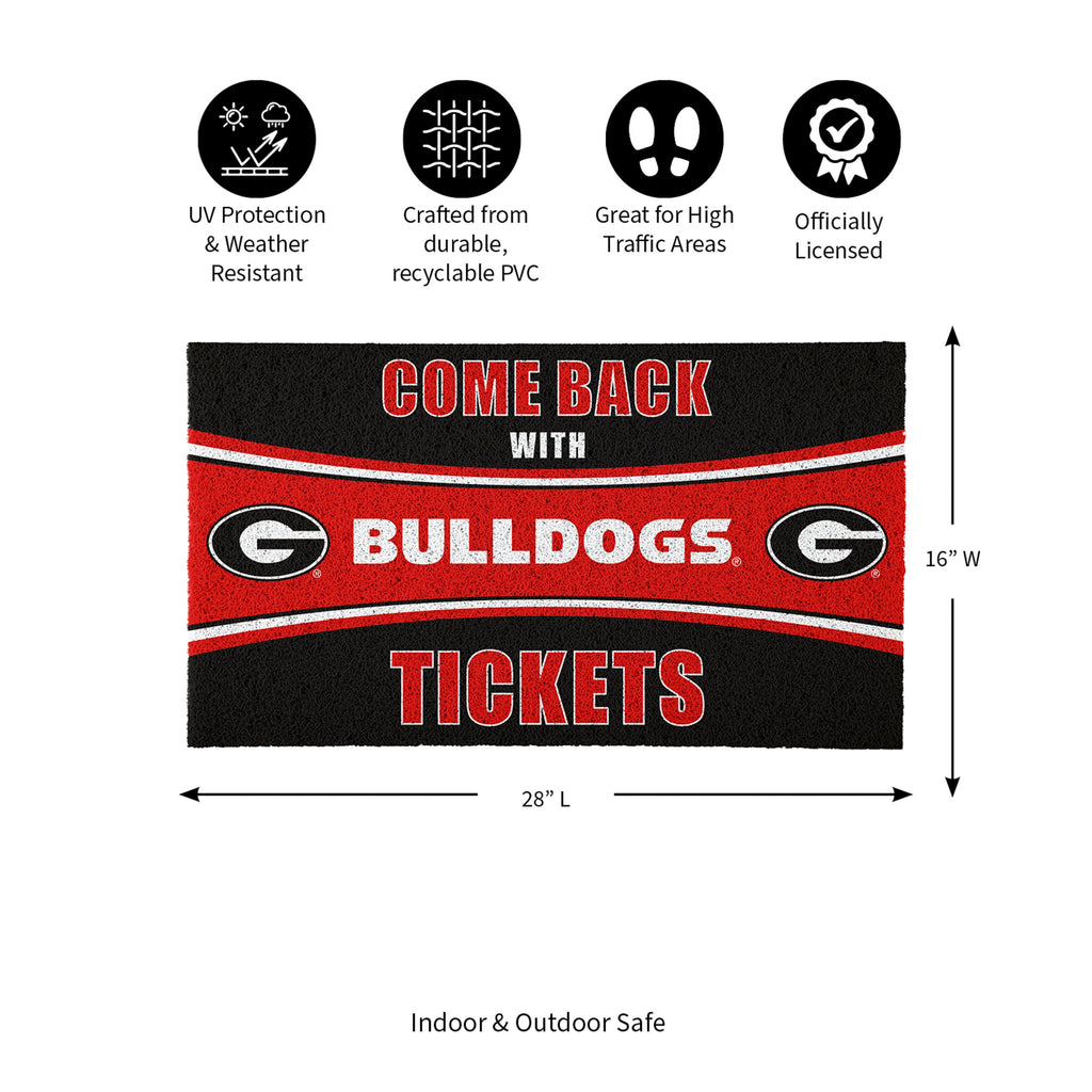 Show your support for the University of Georgia with this 28" x 16" PVC Trapper Mat, featuring 'Come Back with Tickets' in bold lettering. Perfect for both indoor and outdoor use, this mat offers durability and style.