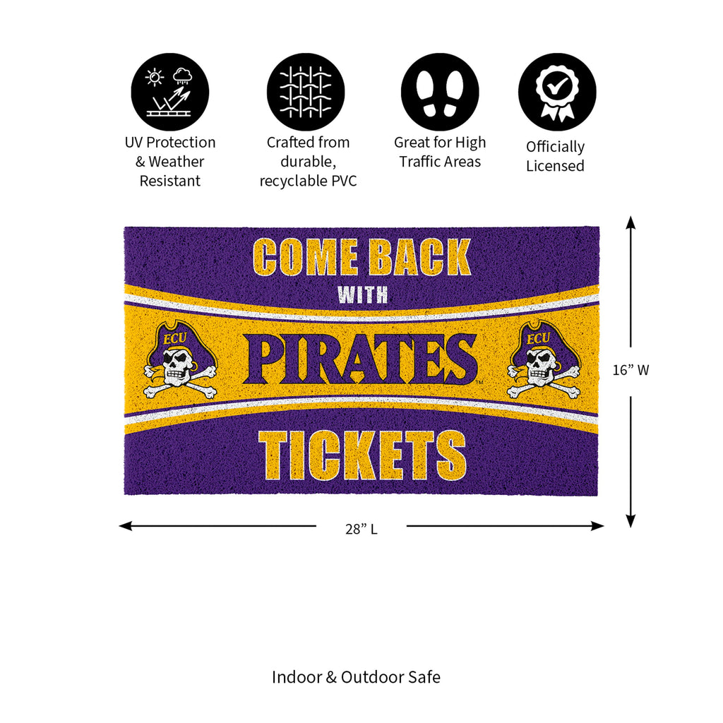 Show your support with this 28" x 16" PVC Trapper Mat featuring the 'Come Back with Tickets' design, perfect for East Carolina University fans. Crafted for durability and weather resistance, it is ideal for both indoor and outdoor use.