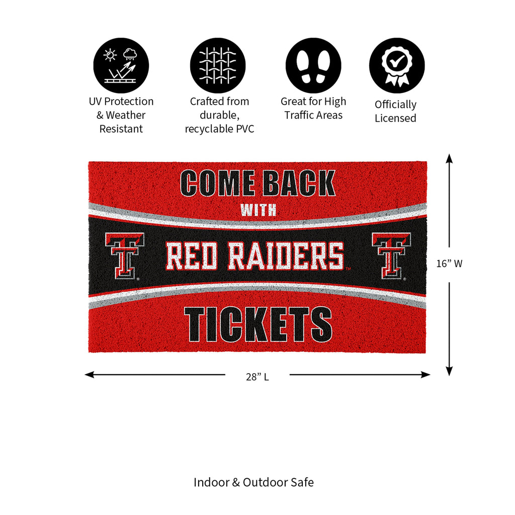 Show your Texas Tech University pride with this officially licensed 28" x 16" PVC trapper mat, featuring a bold 'Come Back with Tickets' design. Perfect for both indoor and outdoor use.
