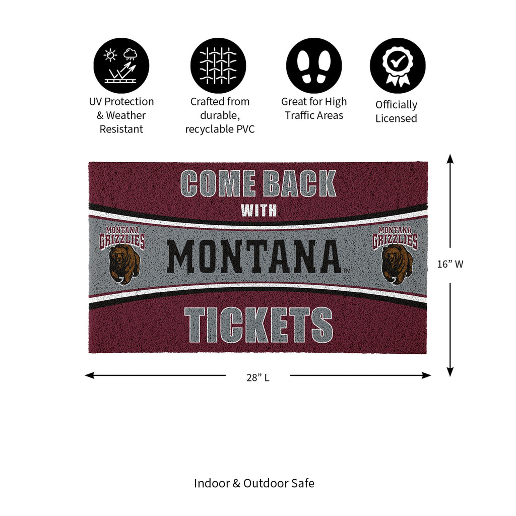 Show your support for the University of Montana with this 28" x 16" PVC trapper mat, perfect for any ardent fan. Featuring a bold 'Come Back with Tickets' design, this mat is both durable and stylish.