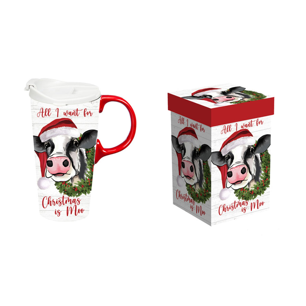 Ceramic Perfect Travel Cup, 17oz, w/ Gift Box, All I Want For Christmas Is Moo,3ctc10143