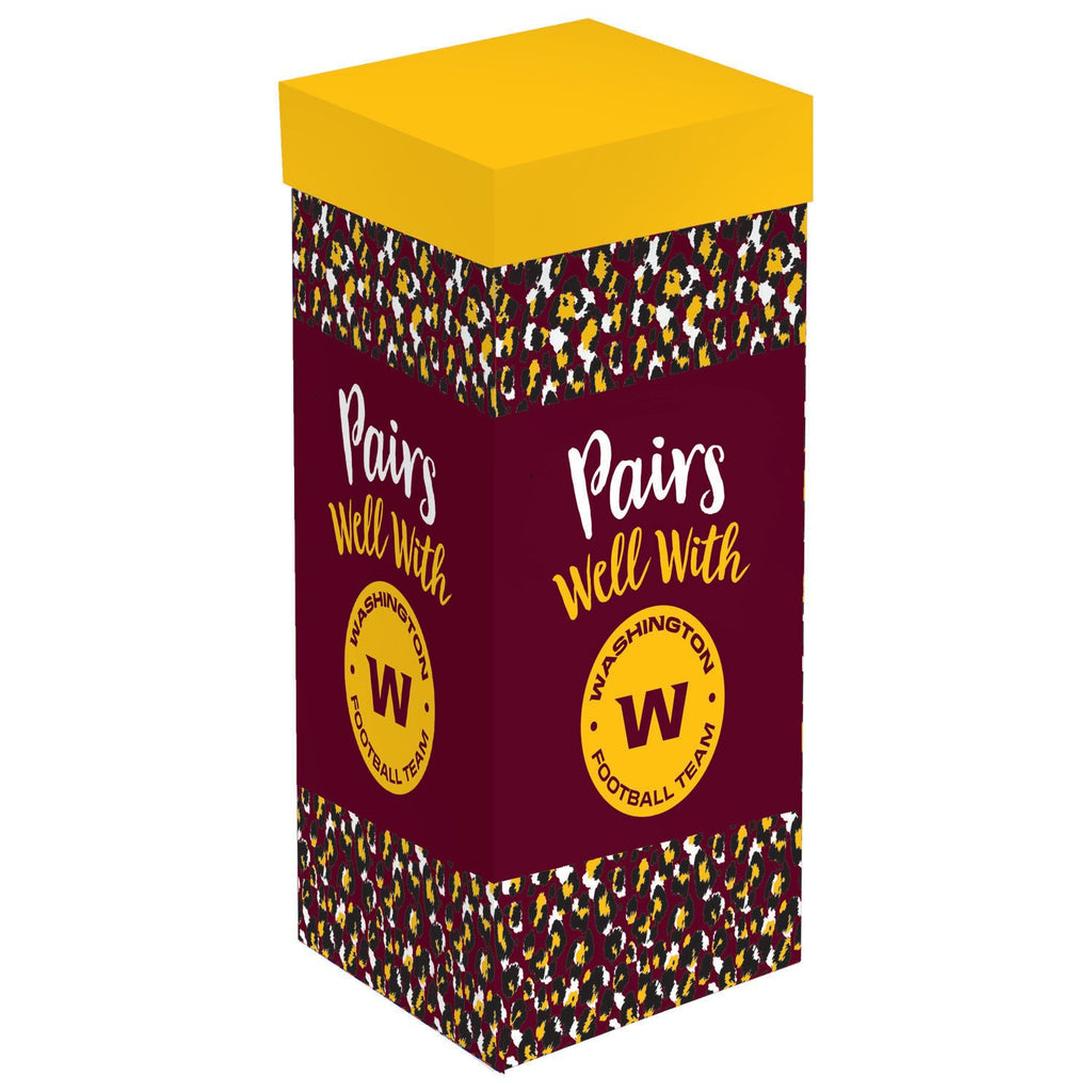This stemmed wine glass features the NFL team colors and logo. The base has an animal print pattern. It holds up to 17 oz. of cold liquid. Comes with a matching gift box. Reads: Pairs well with Arizona Cardinals.