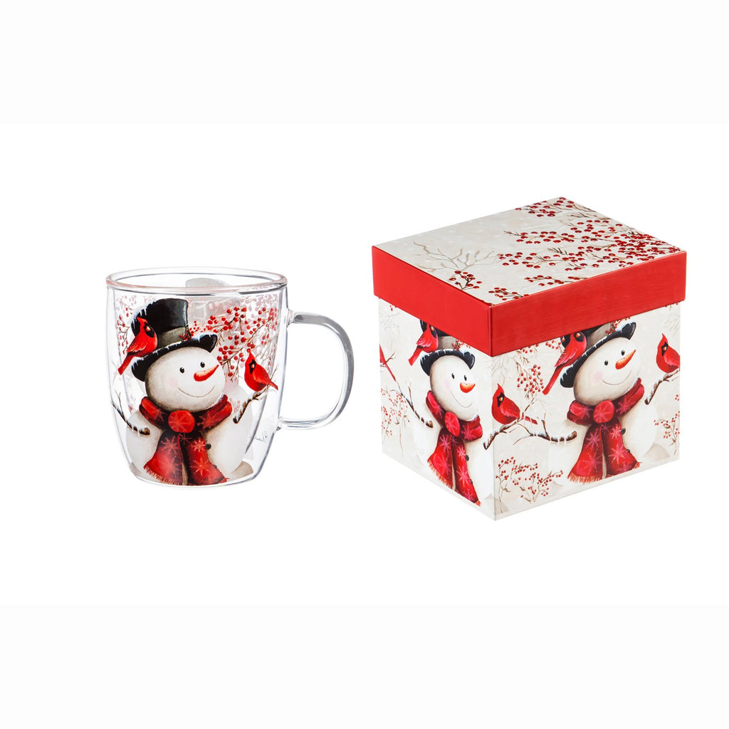 Double Wall Glass Cafe Cup w/ Box, 12 OZ., Snowman and Cardinal,3gcc6605