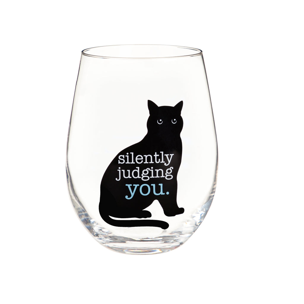 This stemless wine glass reads: "Silently Judging You" in a black cat shadow. The glass holds 17 ounces and comes with a coordinating box perfect for gifting. Hand wash only, do not microwave.