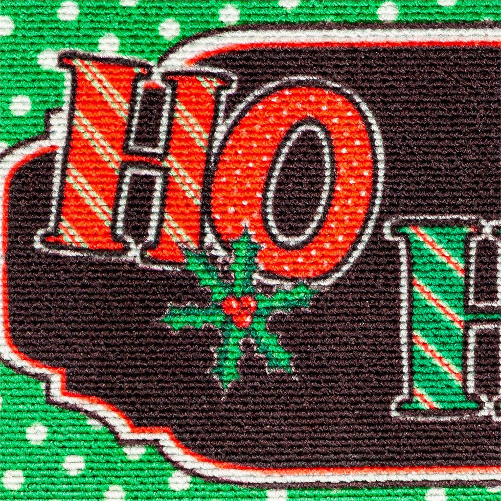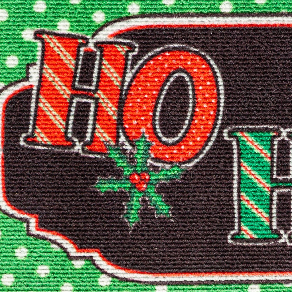 Give friends and family a place to wipe their feet before they join in on the festivities with this Ho Ho Ho Sassafras Switch Mat. It features Santa’s well-known laugh with a vibrant green polka dot background that’s sure to catch everyone’s attention. Crafted from heat-sublimated materials with a rubber backing, this versatile mat is designed to fit perfectly within Evergreen’s switch doormat bases. They mildew resistant mat is ideal for indoor or outdoor use and features a skid-resistant backing to help keep it in place. This welcoming mat will freshen up your stoop season after season while ensuring your home stays debris-free. For stains, simply spot clean with soap and warm water.