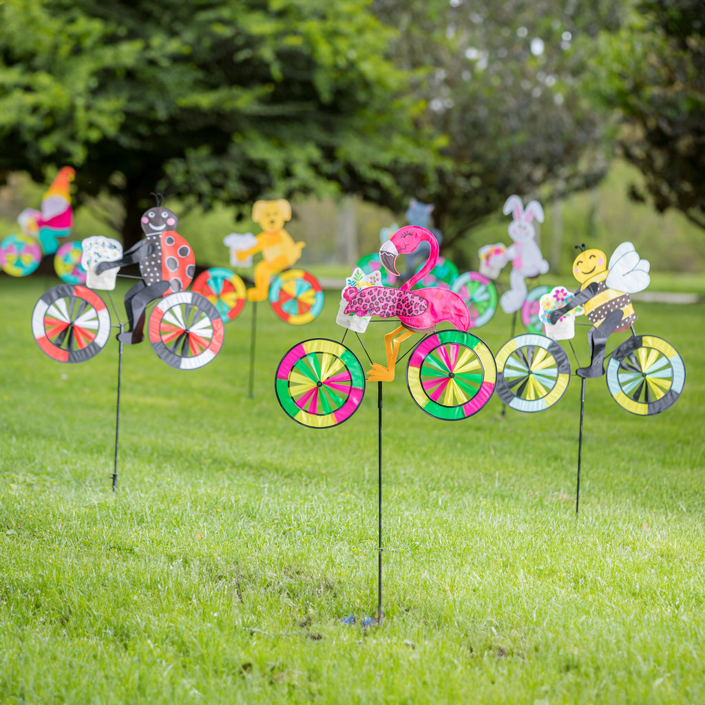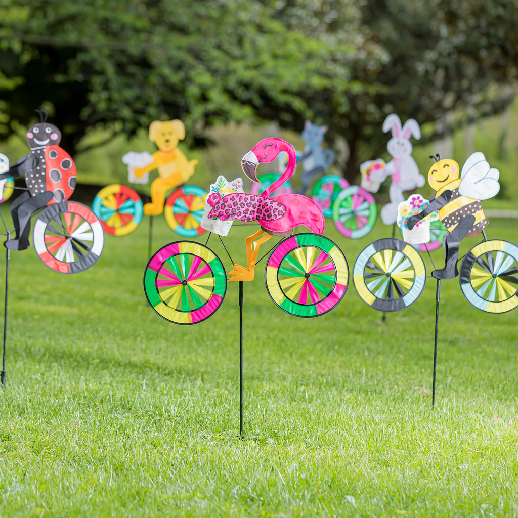 Colorful wheels spin in the breeze as this Flamingo Bicycle Spinner adds whimsy to any outdoor space. This large spinner stands 50” tall, creating a statement bursting with color and character! The weather-resistant polyester construction and superior des