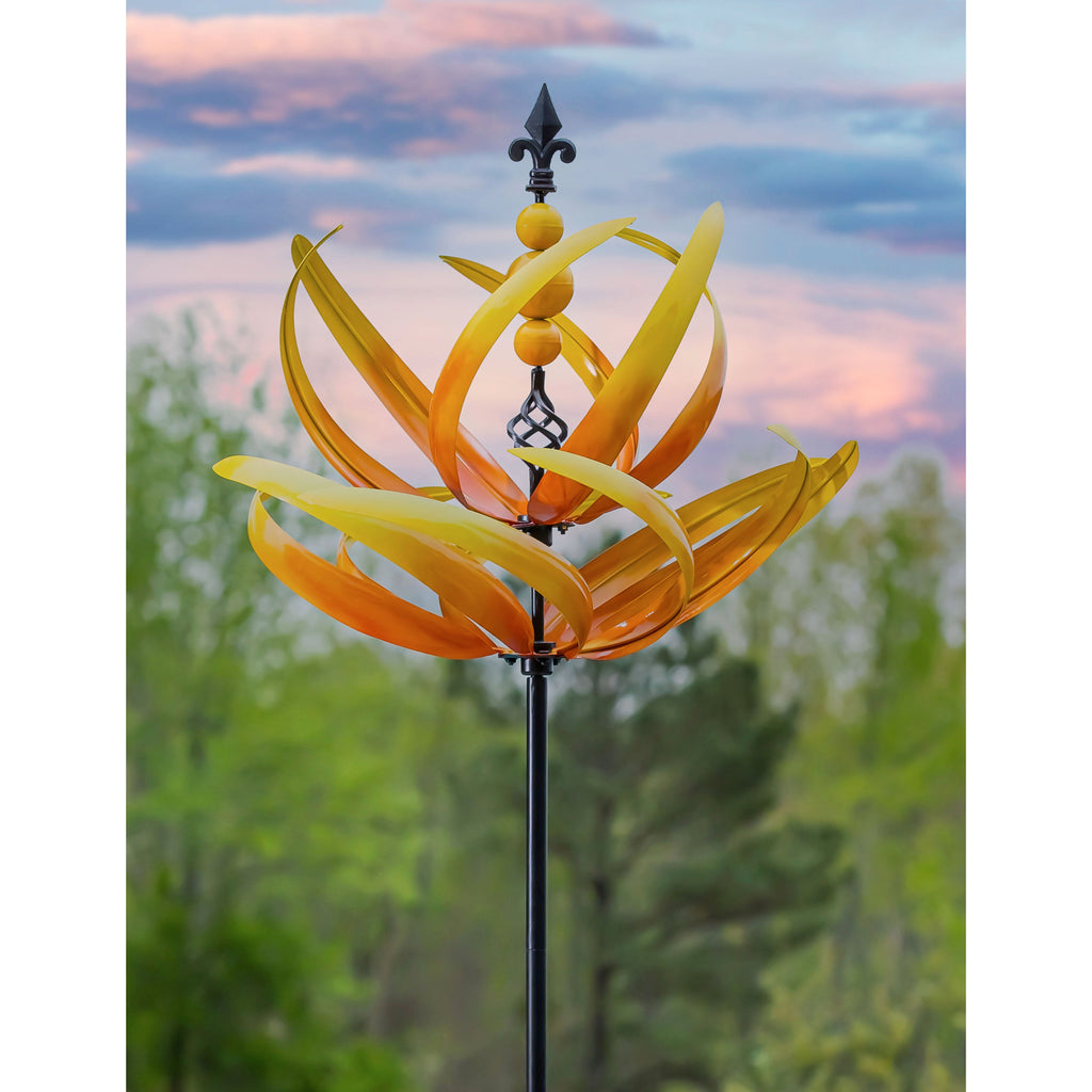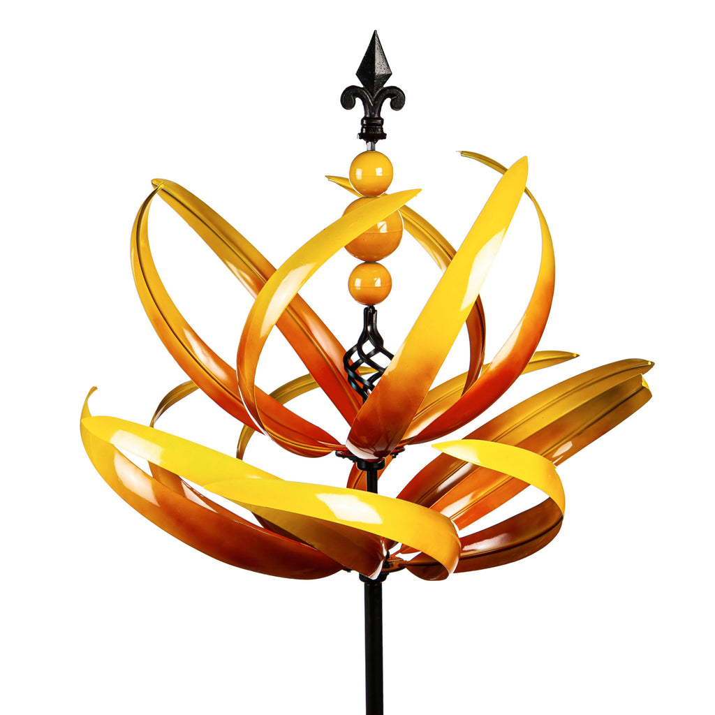 Add dimensional movement to any outdoor space and harness the power of the wind with this Yellow Lotus Wind Spinner. The striking kinetic is made of powder-coated metal with a weather- and rust-resistant finish to prevent fading. Once the stake is put tog
