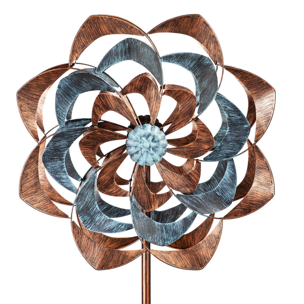Enhance your garden with this beautiful 75-inch wind spinner featuring blue and copper tones. Its elegant design captures the wind to create a mesmerizing visual display.