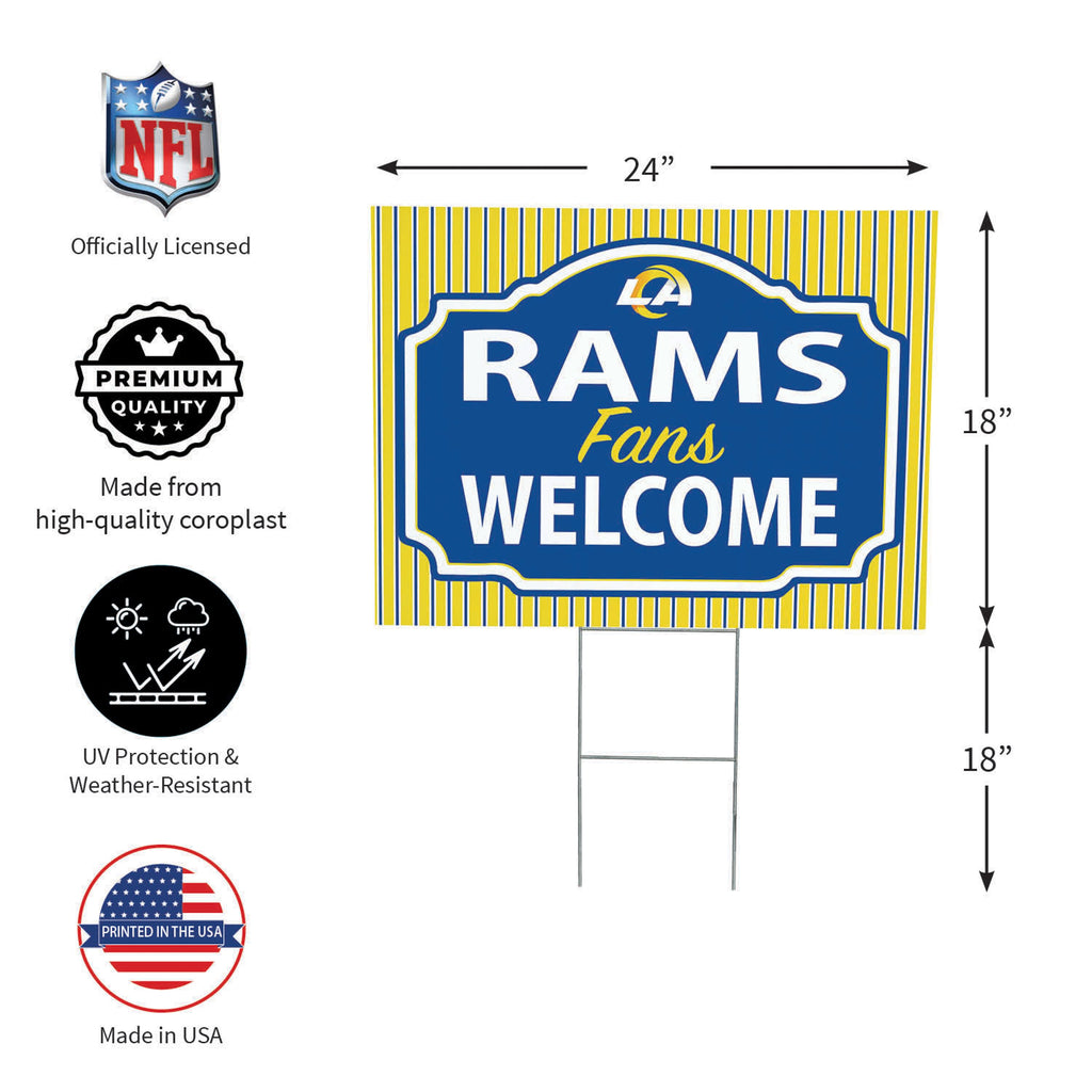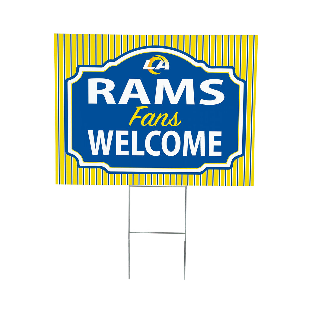 Show your team spirit with this Los Angeles Rams yard sign, perfect for any fan's garden or patio. The bold design features the Rams logo and the message 'Fans Welcome,' making it a great addition to your outdoor decor.