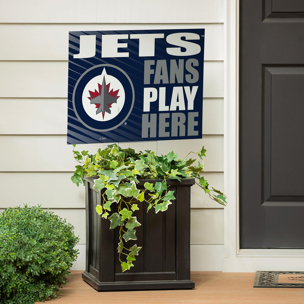 Show your support for the Winnipeg Jets with this vibrant yard sign that boldly states 'Fans Play Here,' perfect for any garden or outdoor space.