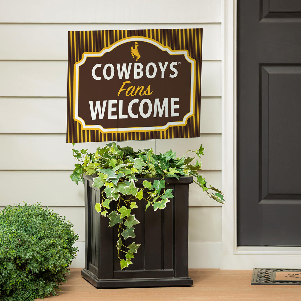 Show your team spirit with this University of Wyoming 'Fans Welcome' yard sign, perfect for any outdoor display. Its durable construction ensures long-lasting use.