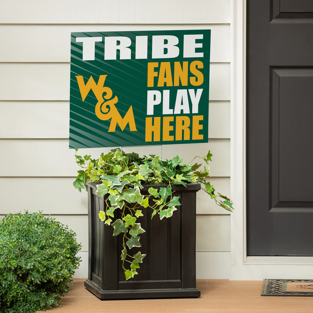 Show your support for William & Mary with this vibrant yard sign, perfect for any fan's garden. The sign features bold green and gold colors with the message 'Fans Play Here', adding a lively touch to your outdoor space.