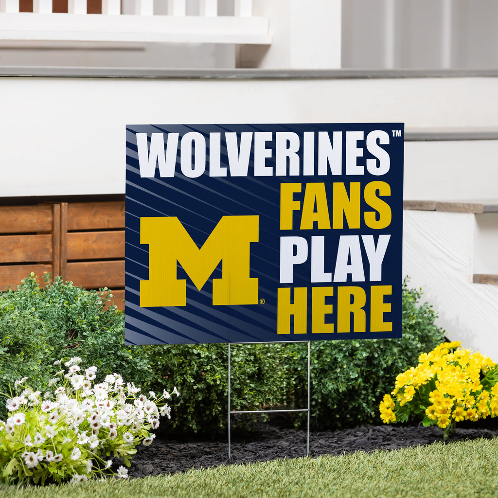 Show your team spirit with the University of Michigan 'Fans Play Here' yard sign. Perfect for gardens, this sign is easy to install and adds a vibrant touch to any outdoor space.