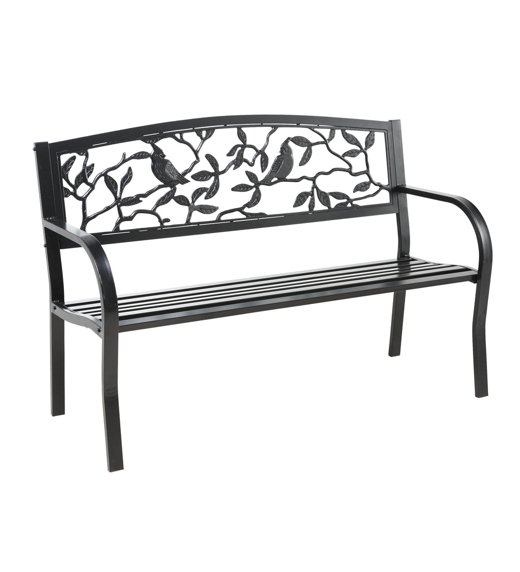 This charming garden bench features a back design with cardinals on leafy branches. The classic black finish with brushed highlights lends a timeless look to any setting. Sturdy steel frame; cast iron back design panel.
