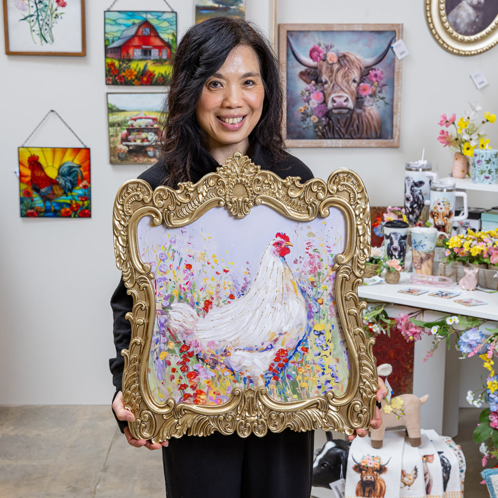 Enhance your living space with the Petal & Plow Indoor Wall Decor, featuring a charming chicken design in a luxurious gold decorative frame.