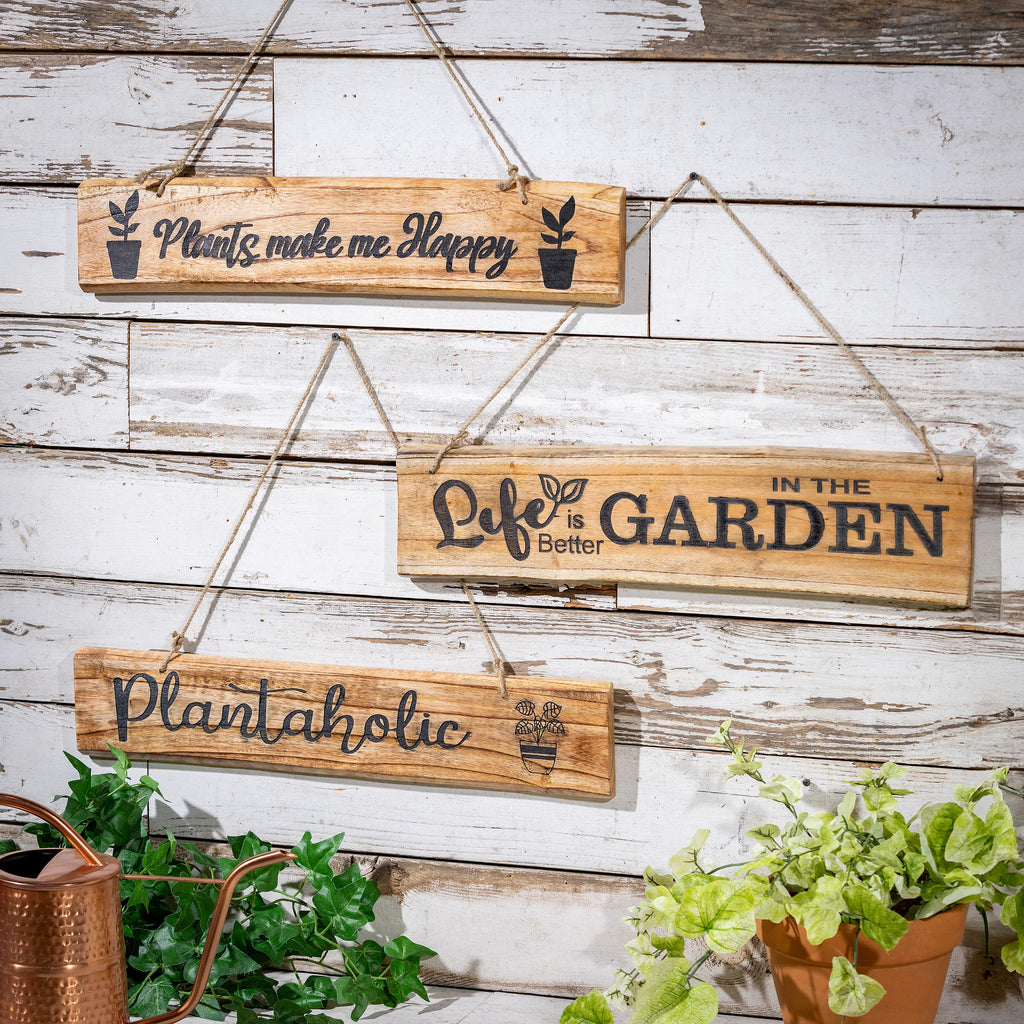 Add a charming touch to your garden with this set of three wooden signs, each featuring a unique garden-themed quote. Crafted from wood and equipped with jute rope, these signs are perfect for personalizing your outdoor space.
