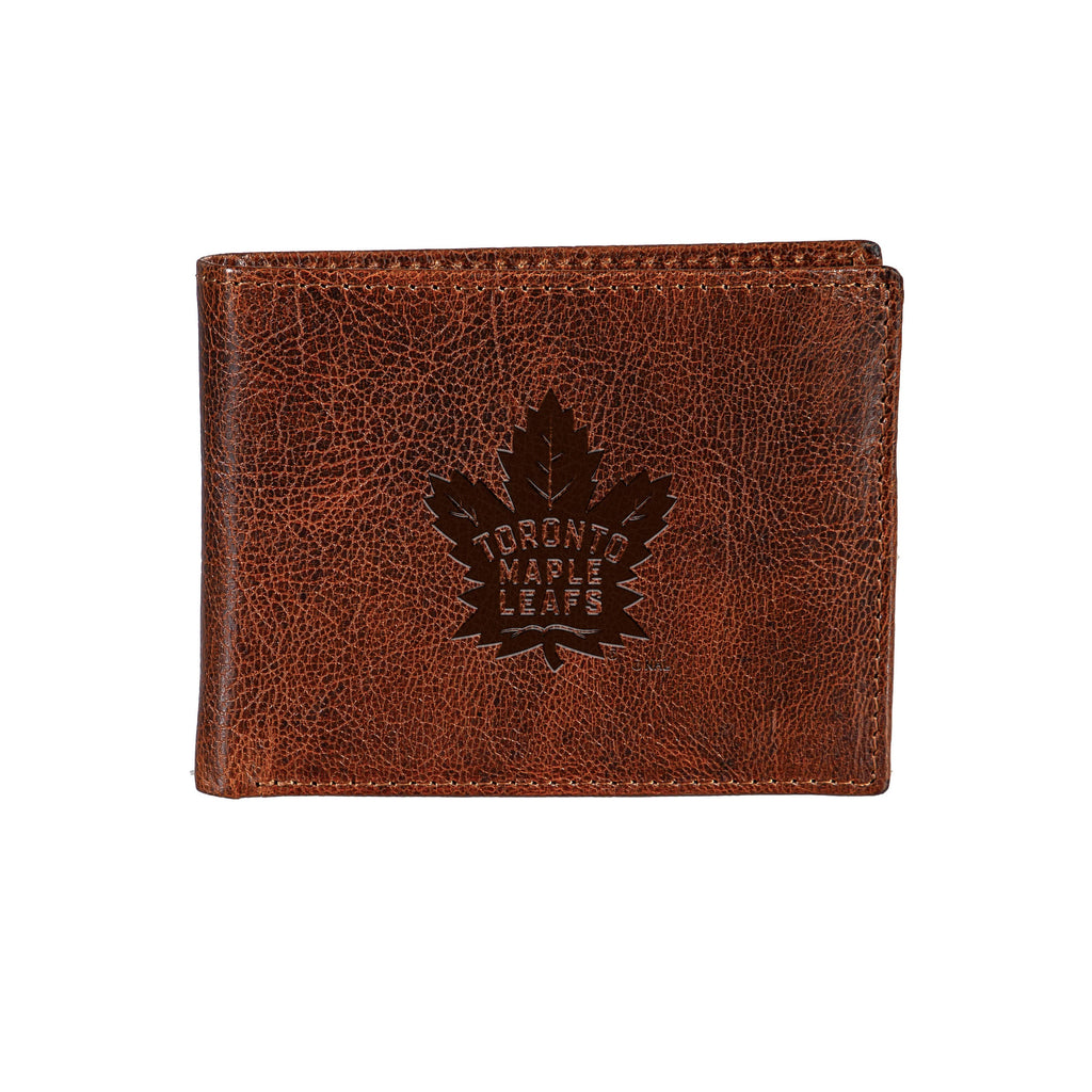 This Toronto Maple Leafs embossed wallet is crafted from 100% genuine tumbled leather, offering a stylish and functional accessory for any fan. It features a classic bi-fold design that accommodates cash and cards effortlessly.