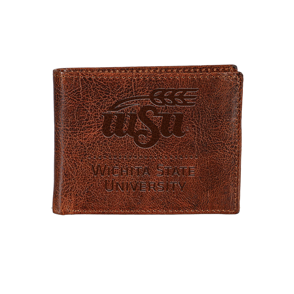 Show your school pride with this Wichita State University embossed bi-fold wallet, crafted from 100% genuine tumbled leather in a rich brown hue.