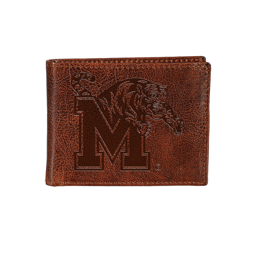 Show your school spirit with this University of Memphis embossed bi-fold wallet, crafted from 100% genuine tumbled leather. It's a stylish and practical way to keep your essentials organized.