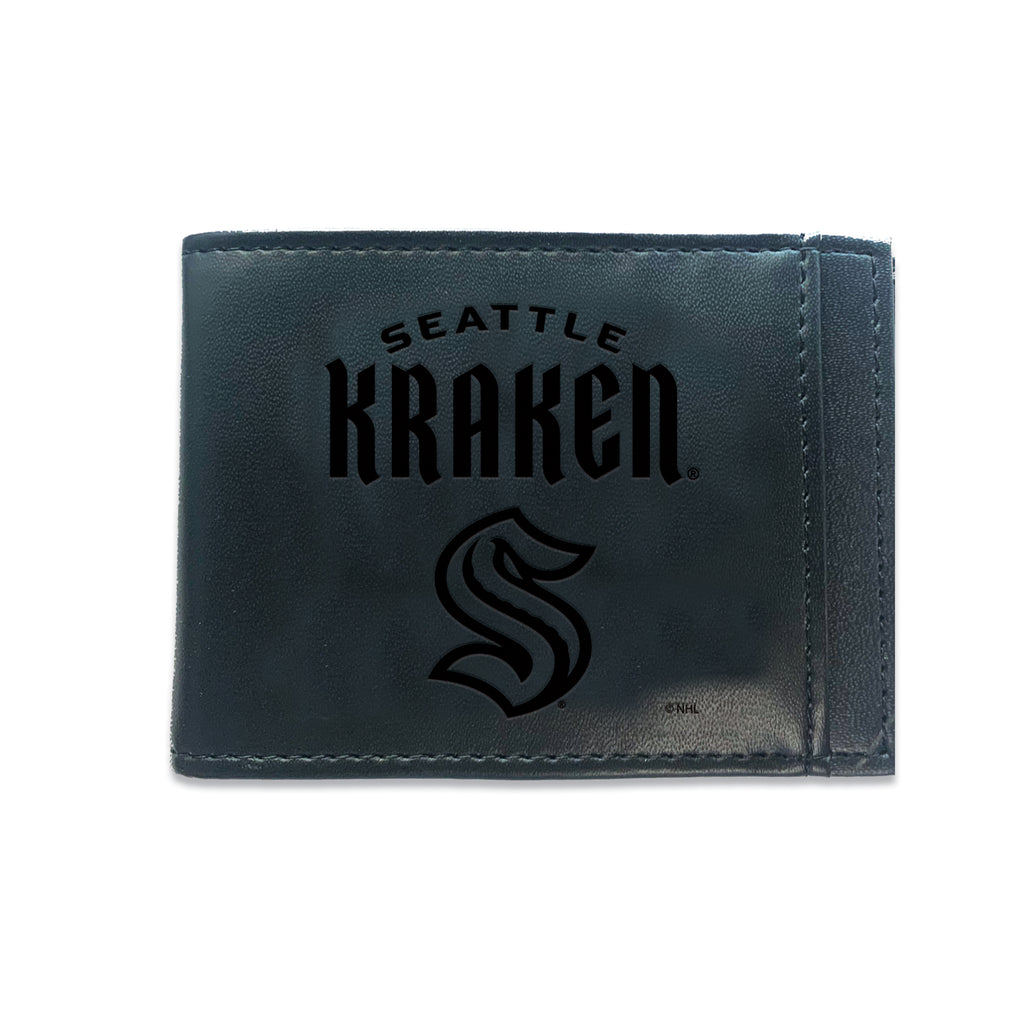 This sleek black front pocket wallet features RFID blocking technology and is designed with Seattle Kraken branding.