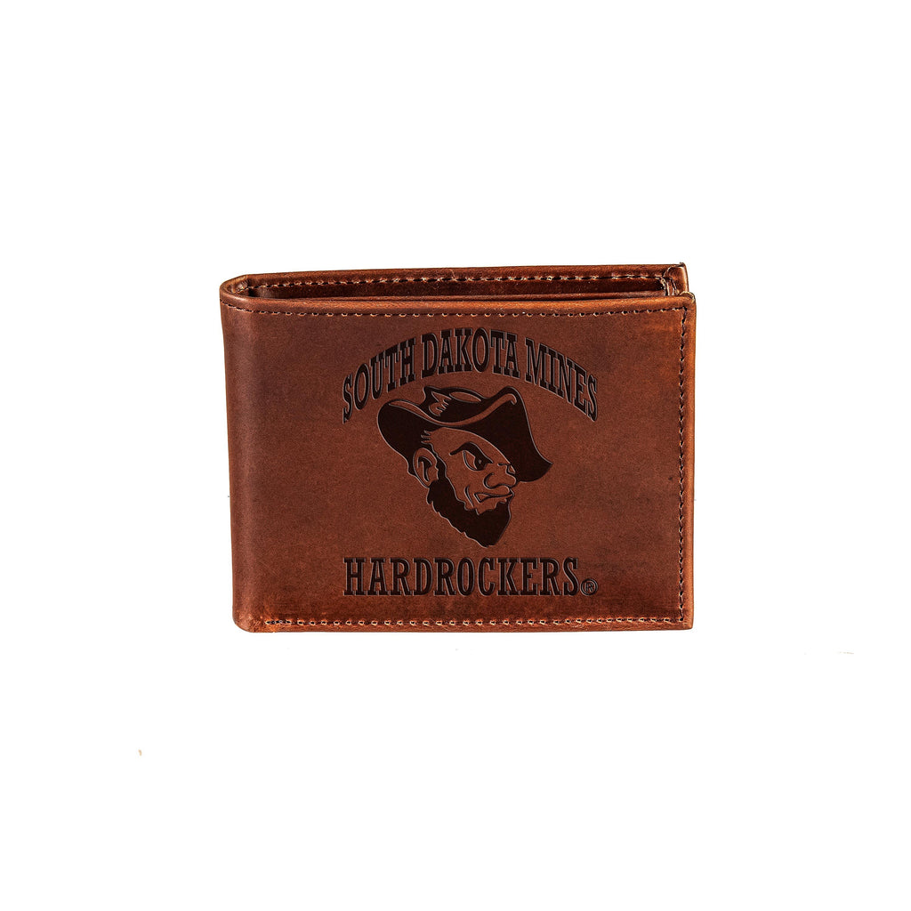 This brown bi-fold wallet showcases the South Dakota School of Mines & Technology logo, crafted from 100% genuine leather for durability and style.